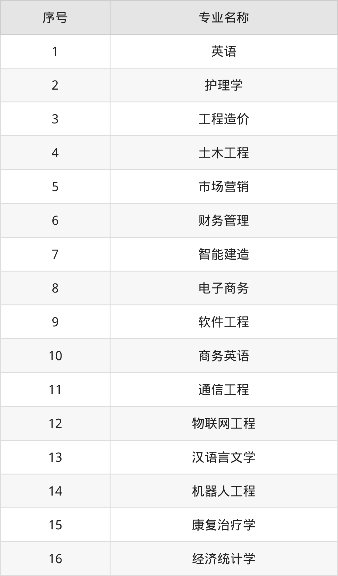 物理类(理科)本科招生专业:护理学、智能建造、电子商务、市场营销、商务英语、财务管理、通信工程、土木工程、工程造价、软件工程等。