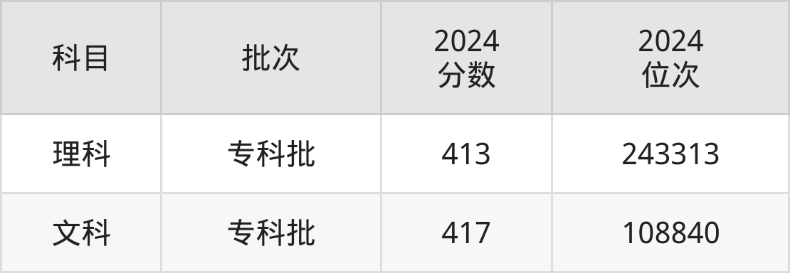 2024年西昌医学高等专科学校在四川省内专科批的录取分数线都在410分以上,在文科的录取分数线为417分;理科的录取分数线为413分。