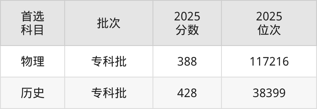 2025年重庆城市管理职业学院在重庆市内专科批的录取分数线都在380分以上,在历史类的录取分数线为428分;物理类的录取分数线为388分。