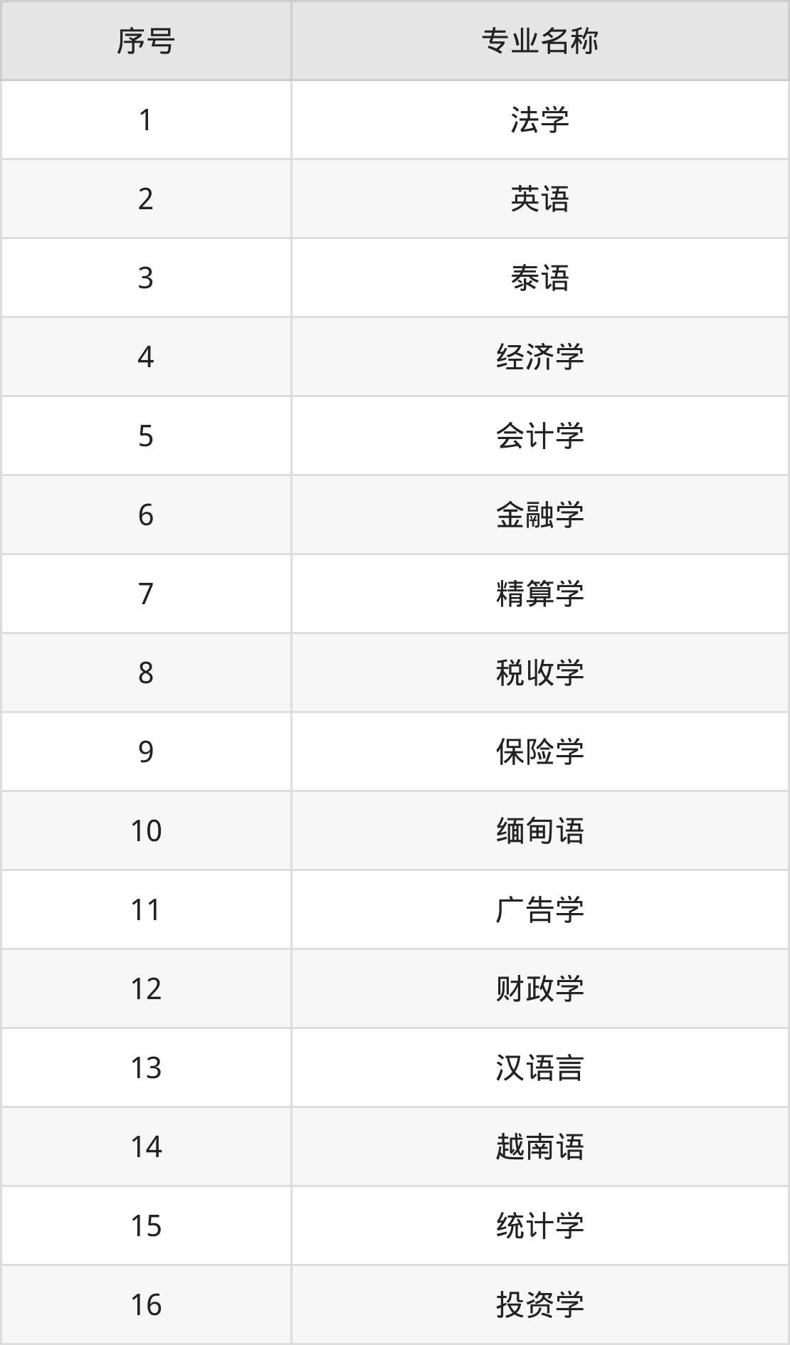 历史类(文科)本科招生专业:英语、泰语、法学、汉语言、财政学、会计学、审计学、新闻学、投资学、越南语等。