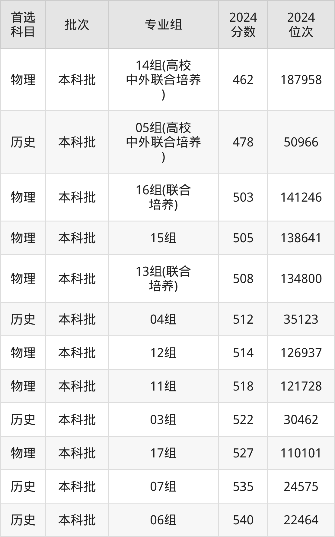 从2024年淮阴师范学院在江苏省内的录取分数线来看,本科批录取分数线都在460分以上,录取分数线最高的是06组,2024年最低分为540分;录取分数线最低的是14组(高校中外联合培养),2024年最低分为462分。