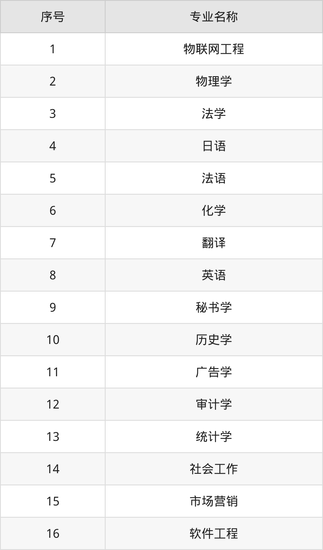 历史类(文科)本科招生专业:英语、法学、法语、日语、翻译、广告学、审计学、历史学、秘书学、行政管理等。