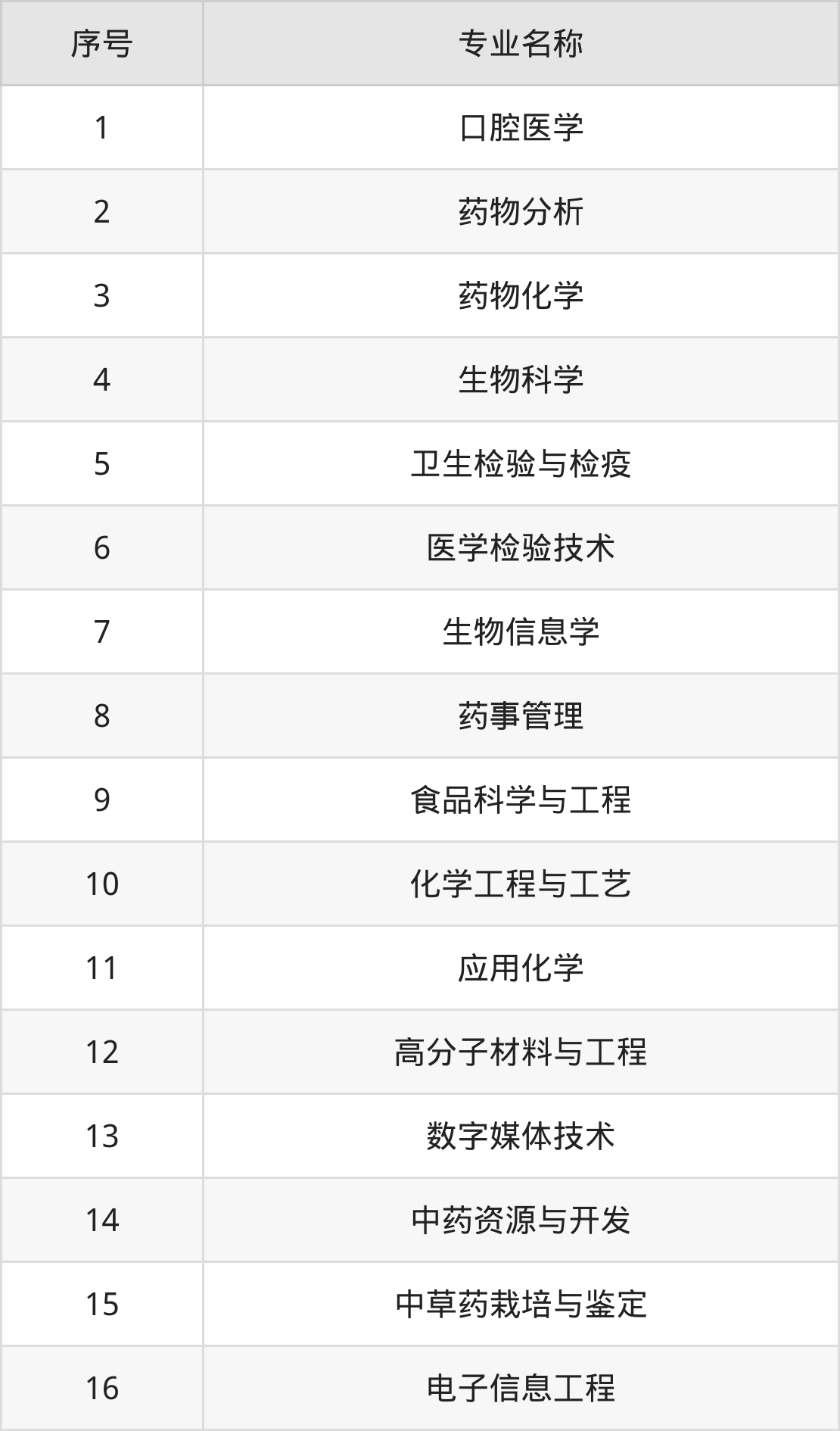 物理类(理科)本科招生专业:口腔医学、药物分析、药物化学、生物科学、卫生检验与检疫、医学检验技术、生物信息学、药事管理、食品科学与工程、化学工程与工艺等。