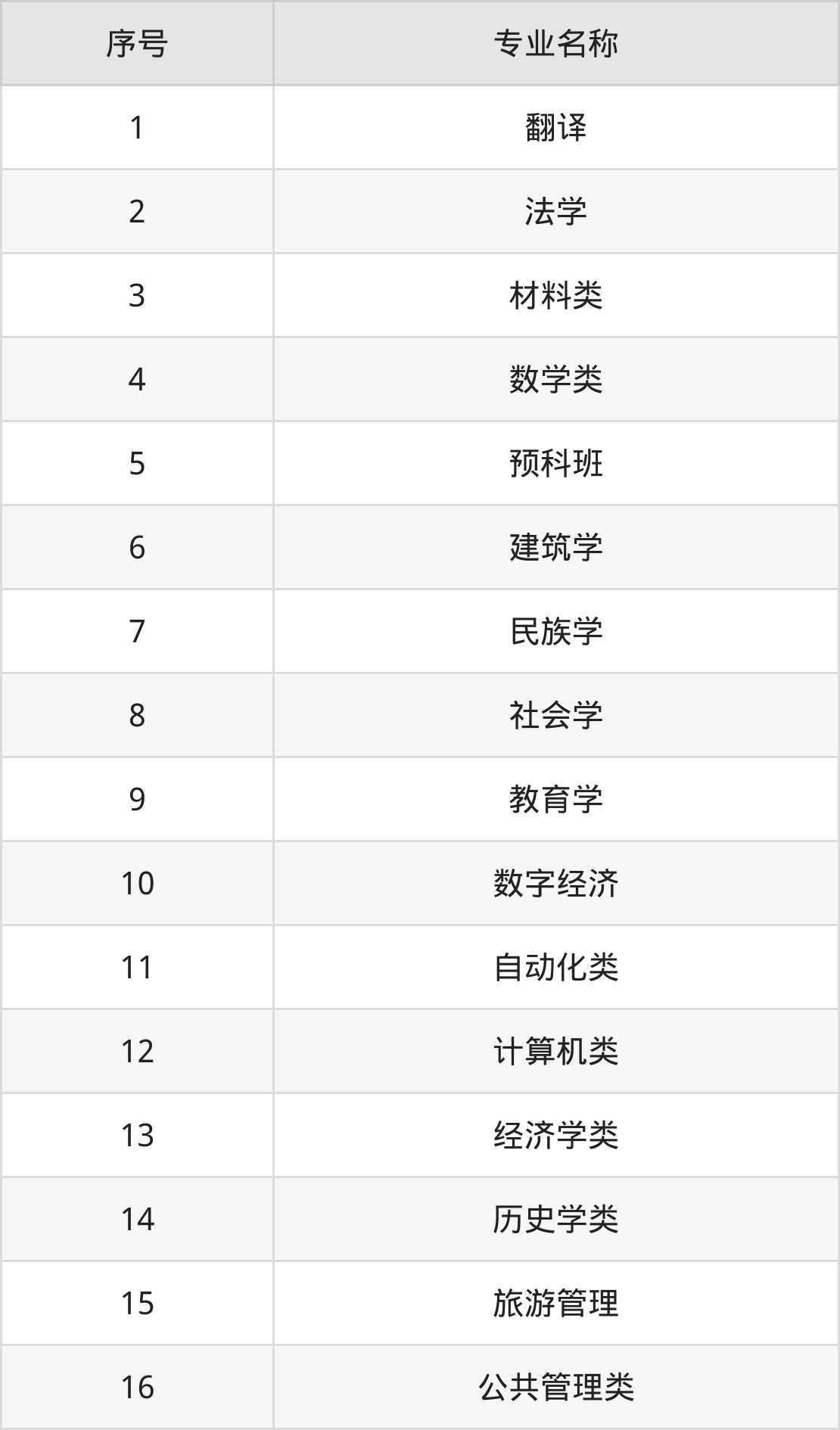 历史类(文科)本科招生专业:法学、翻译、社会学、预科班、教育学、民族学、历史学类、旅游管理、经济学类、工商管理类等。