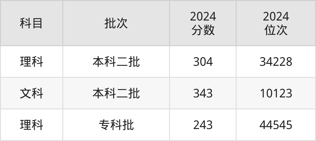 从2024年昌吉学院在新疆维吾尔自治区内的录取分数线来看,本科批录取分数线都在300分以上,录取分数线最高的是文科,2024年最低分为343分;录取分数线最低的是理科,2024年最低分为304分。