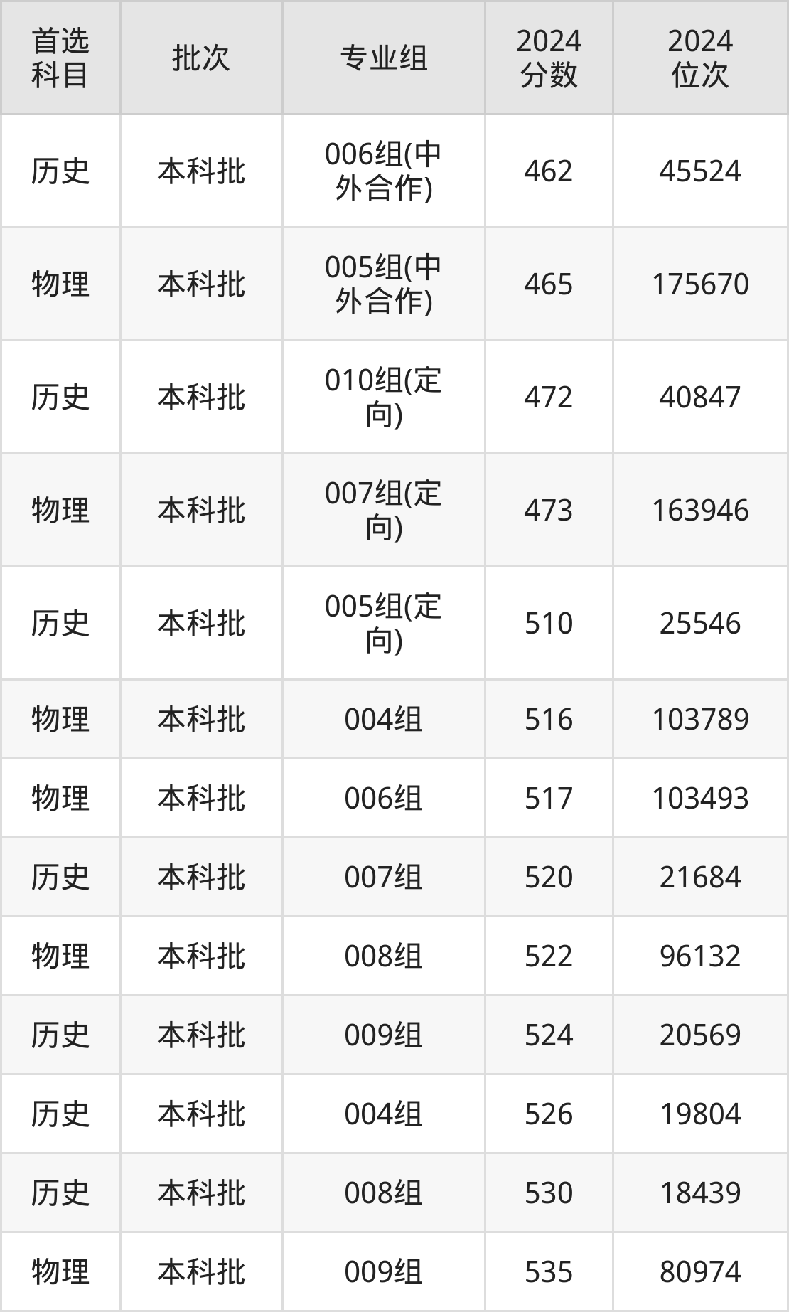 从2024年阜阳师范大学在安徽省内的录取分数线来看,本科批录取分数线都在460分以上,录取分数线最高的是009组,2024年最低分为535分;录取分数线最低的是006组(中外合作),2024年最低分为462分。