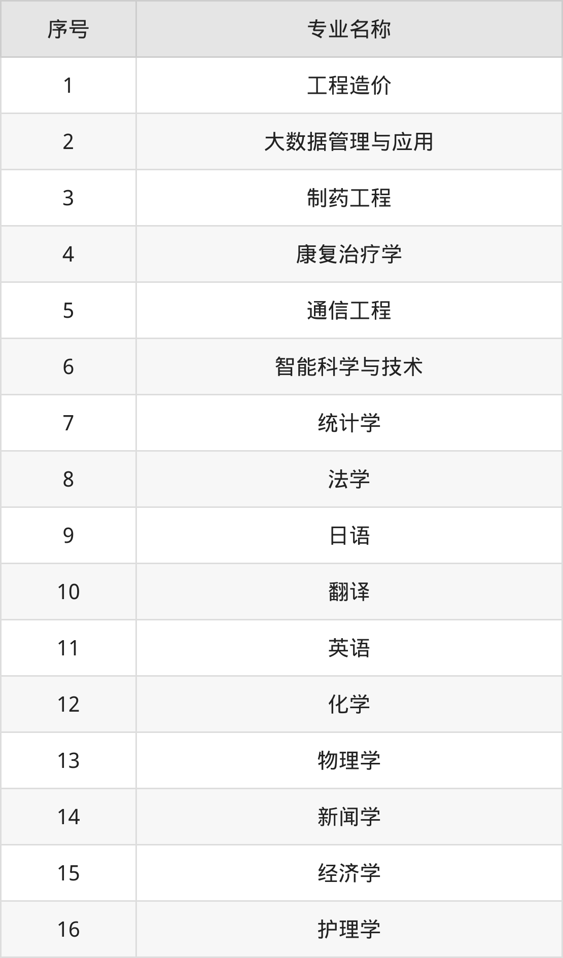 物理类(理科)本科招生专业:工程造价、大数据管理与应用、制药工程、康复治疗学、通信工程、智能科学与技术、统计学、化学、日语、翻译等。