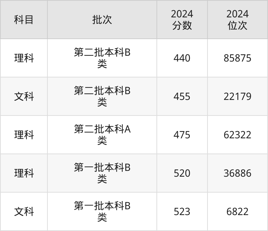 从2024年长治医学院在山西省内的录取分数线来看,本科批录取分数线都在440分以上,录取分数线最高的是文科,2024年最低分为523分;录取分数线最低的是理科,2024年最低分为440分。