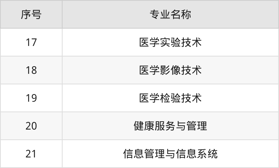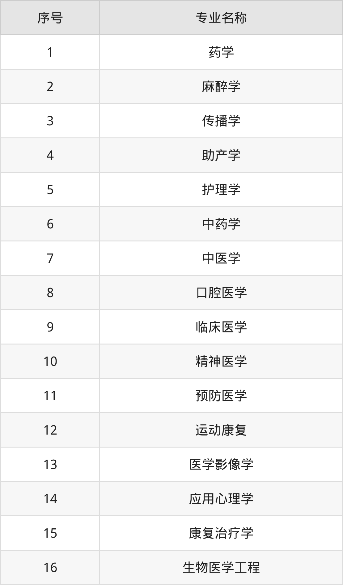 物理类(理科)本科招生专业:药学、中医学、助产学、麻醉学、护理学、中药学、运动康复、口腔医学、精神医学、预防医学等。
