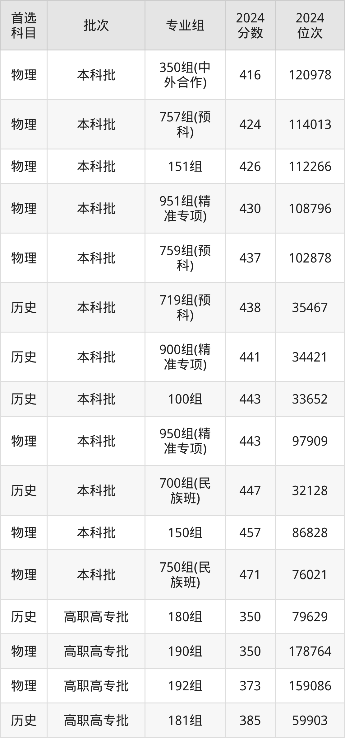 从2024年桂林航天工业学院在广西壮族自治区内的录取分数线来看,本科批录取分数线都在410分以上,录取分数线最高的是750组(民族班),2024年最低分为471分;录取分数线最低的是350组(中外合作),2024年最低分为416分。