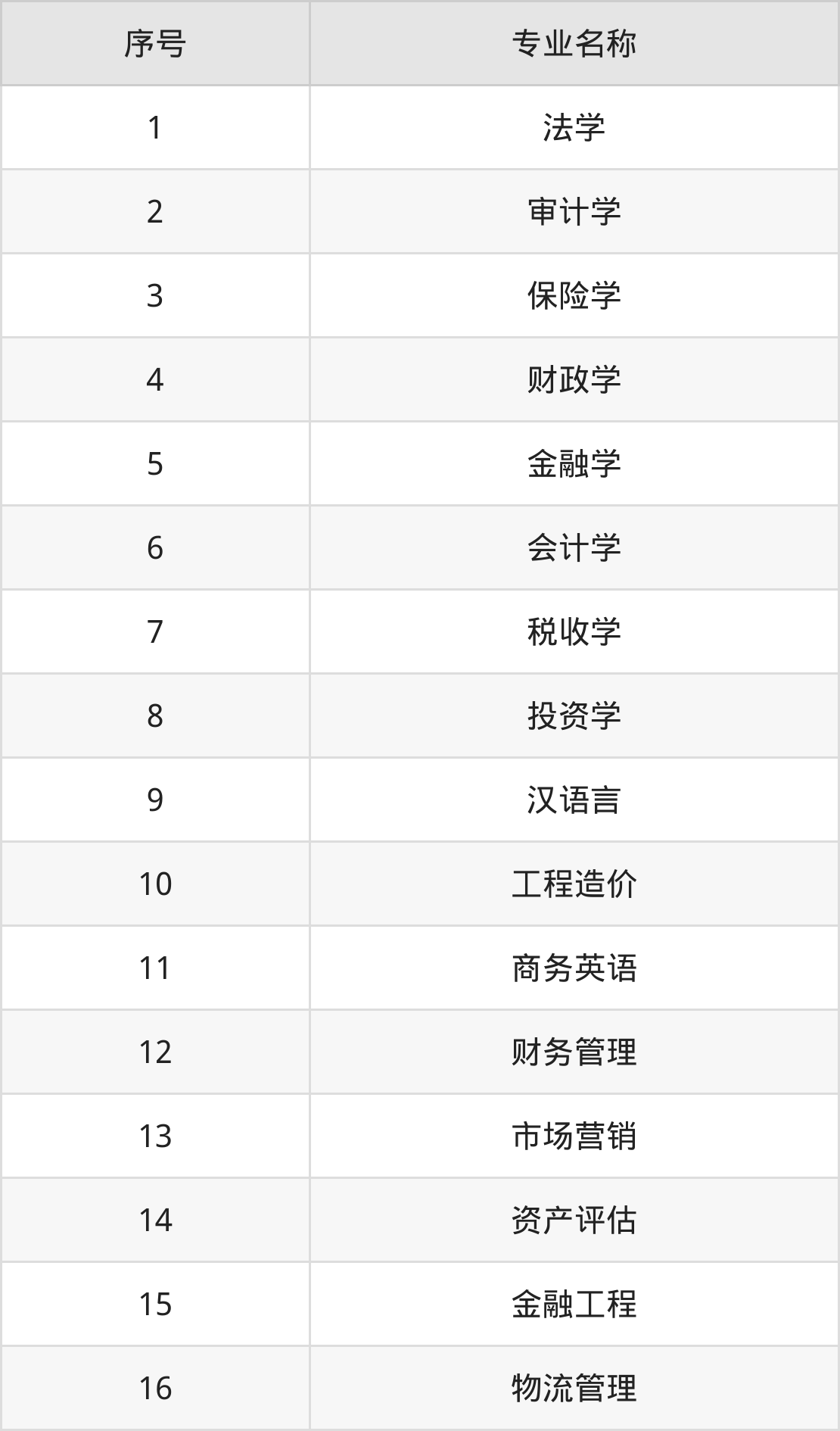历史类(文科)本科招生专业:法学、财政学、金融学、保险学、汉语言、会计学、税收学、投资学、审计学、工程管理等。