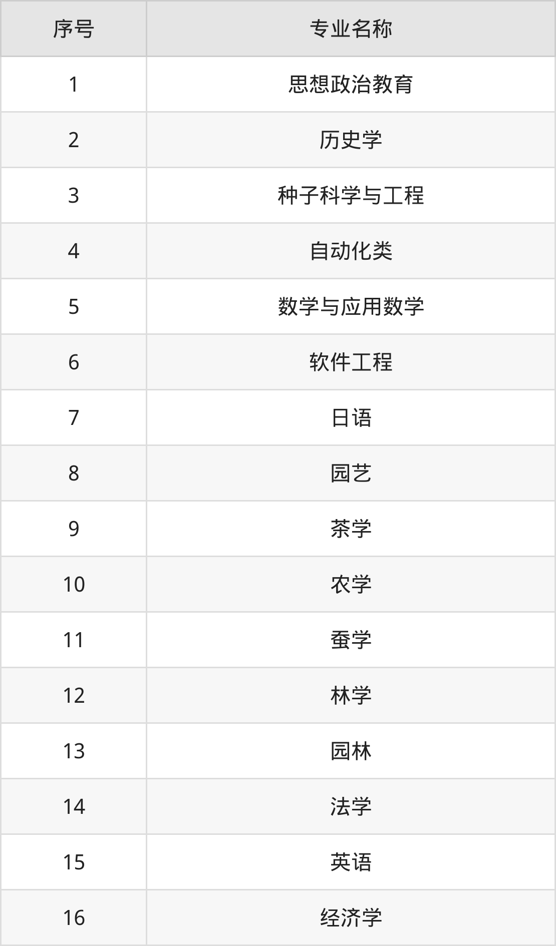 物理类(理科)本科招生专业:种子科学与工程、自动化类、数学与应用数学、软件工程、农学、英语、蚕学、法学、茶学、园林等。