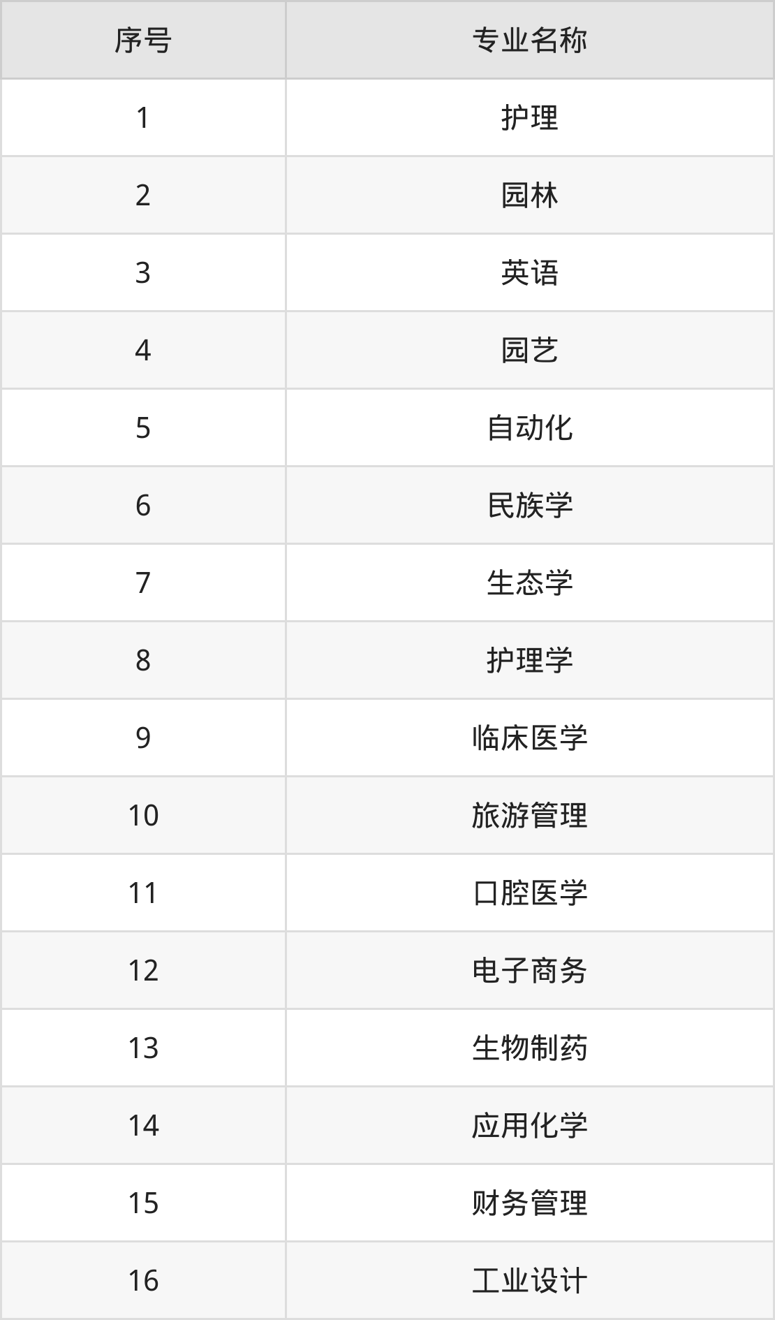 物理类(理科)本科招生专业:园艺、英语、园林、生态学、自动化、护理学、环境工程、电子商务、工业设计、财务管理等。