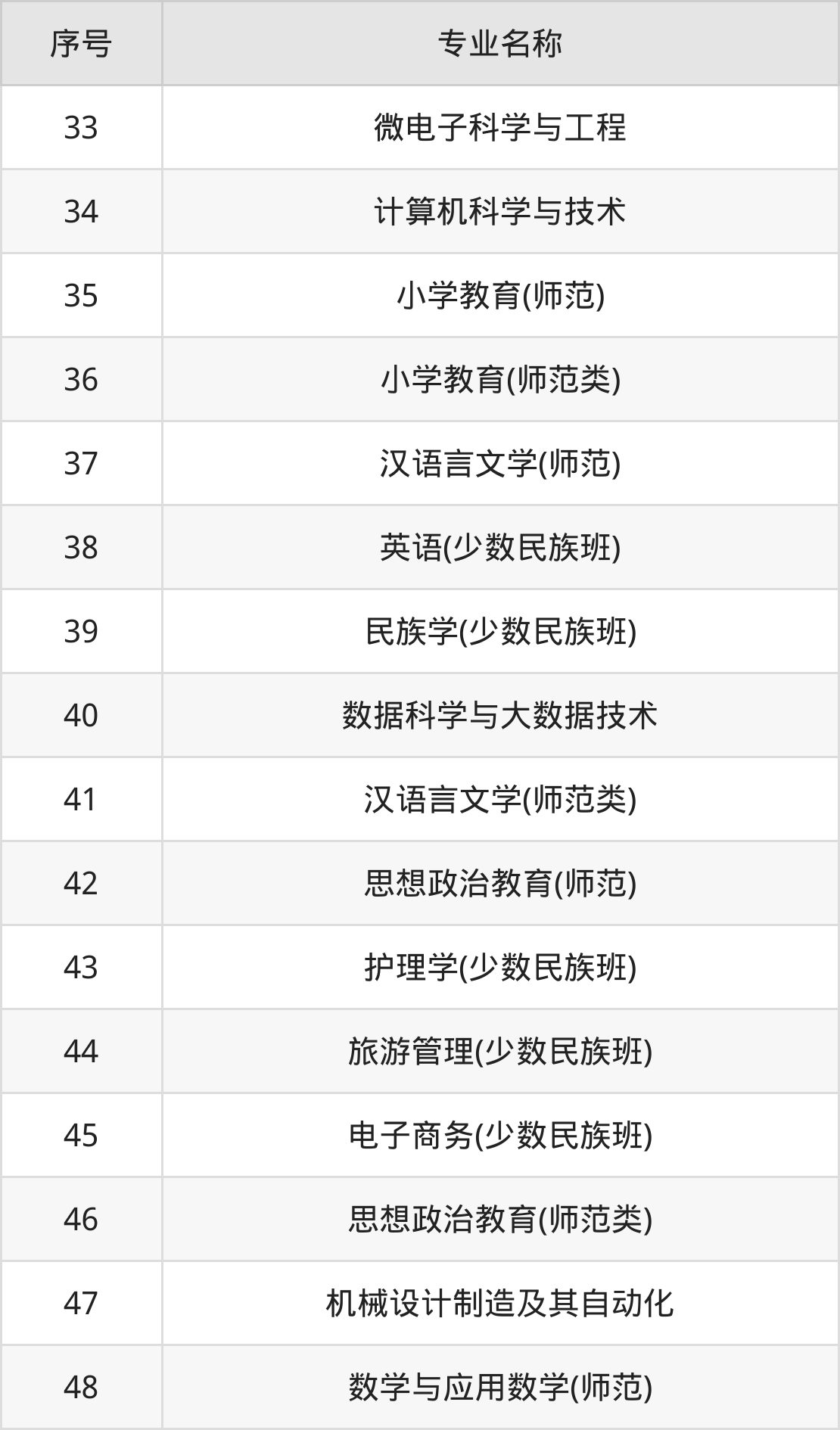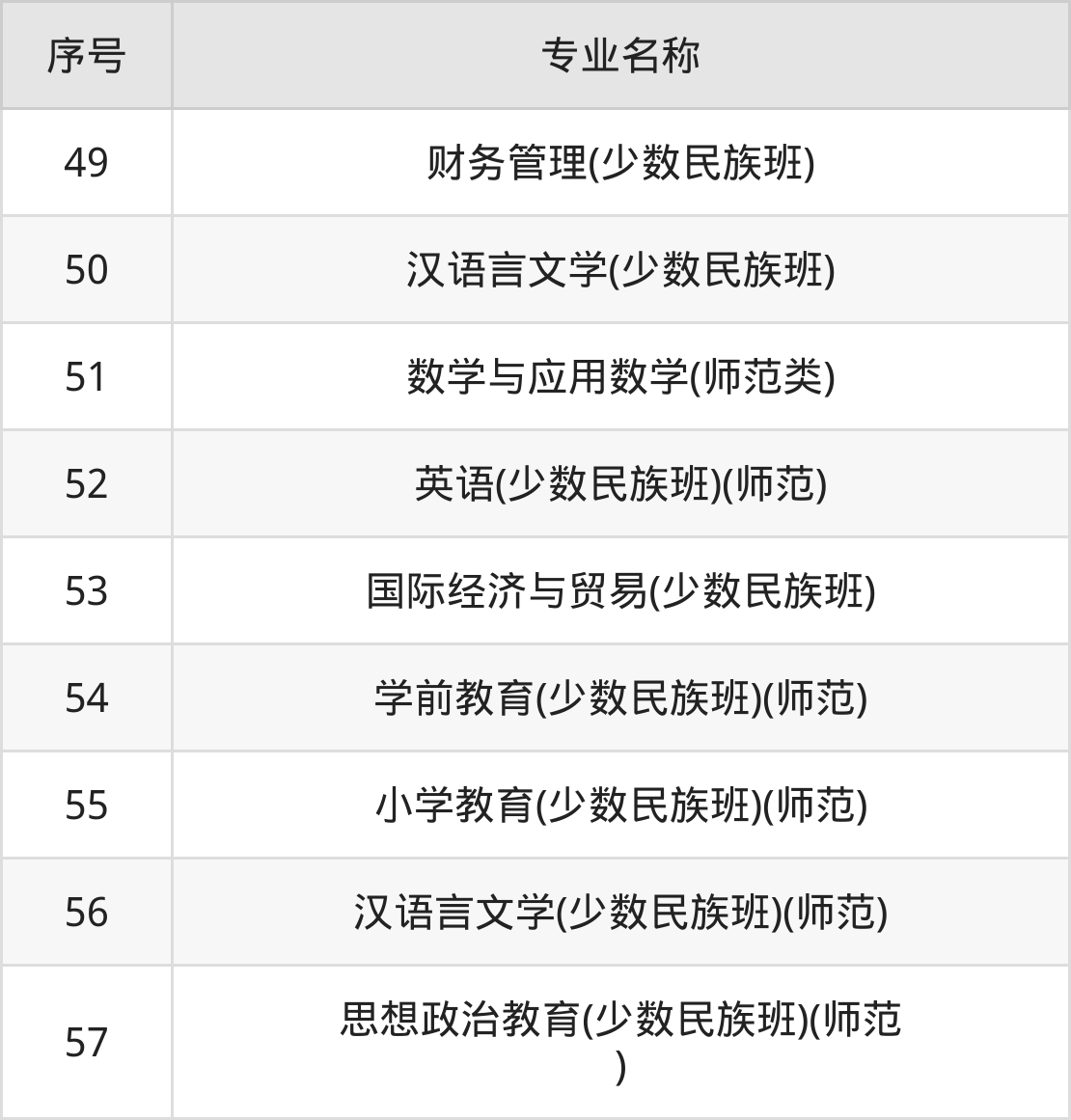 历史类(文科)本科招生专业:英语、民族学、财务管理、电子商务、旅游管理、汉语言文学、本科预科班、英语(师范)、思想政治教育、国际经济与贸易等。