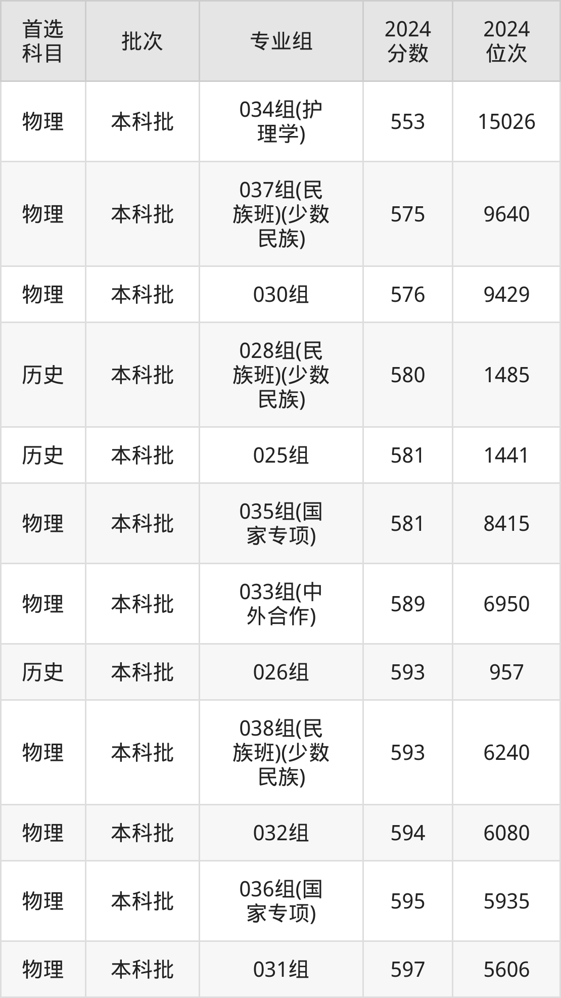 从2024年兰州大学在甘肃省内的录取分数线来看,本科批录取分数线都在550分以上,录取分数线最高的是031组,2024年最低分为597分;录取分数线最低的是034组(护理学),2024年最低分为553分。