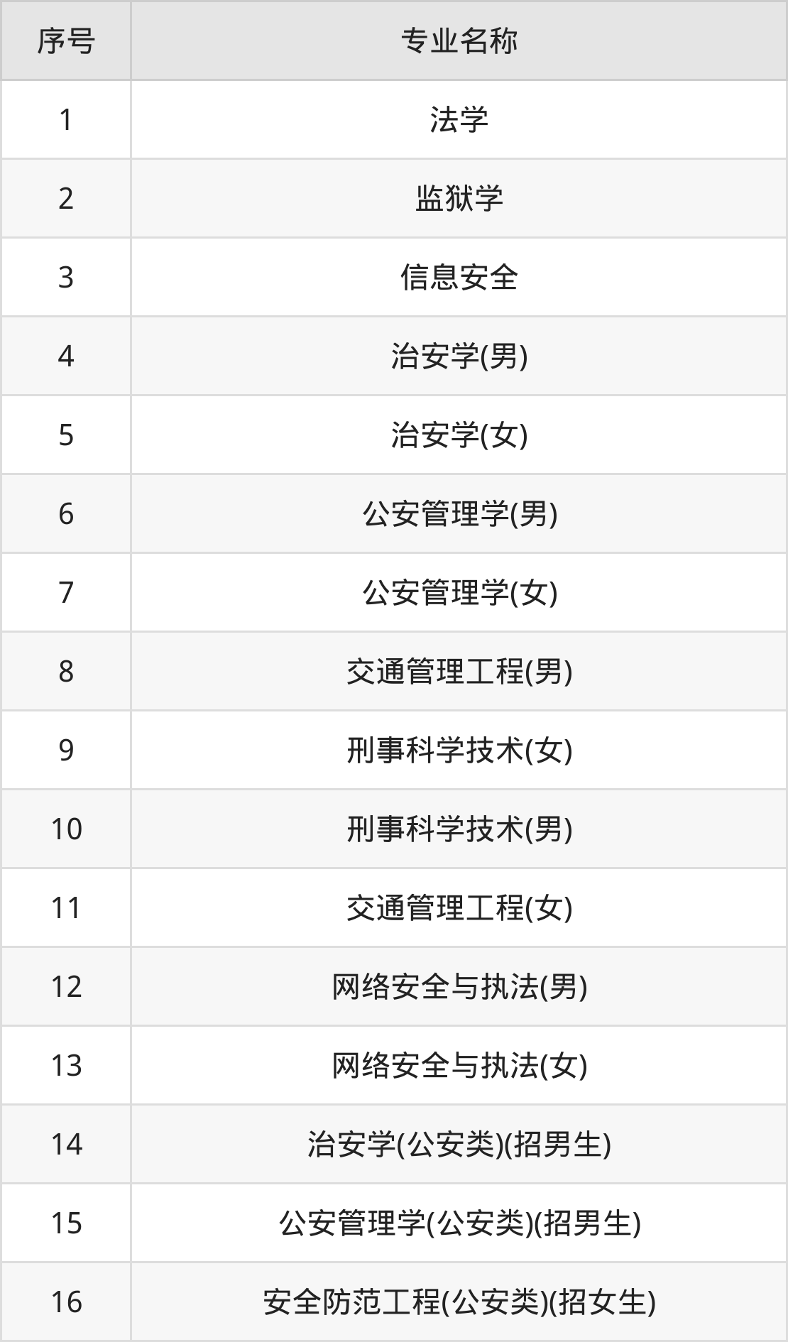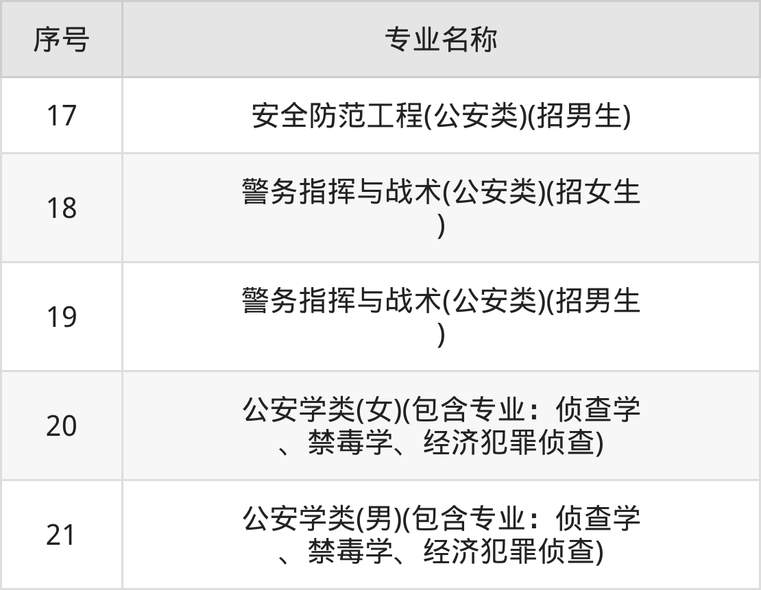 物理类(理科)本科招生专业:法学、监狱学、信息安全、治安学(女)、治安学(男)、公安管理学(女)、公安管理学(男)、刑事科学技术(女)、刑事科学技术(男)、交通管理工程(女)等。