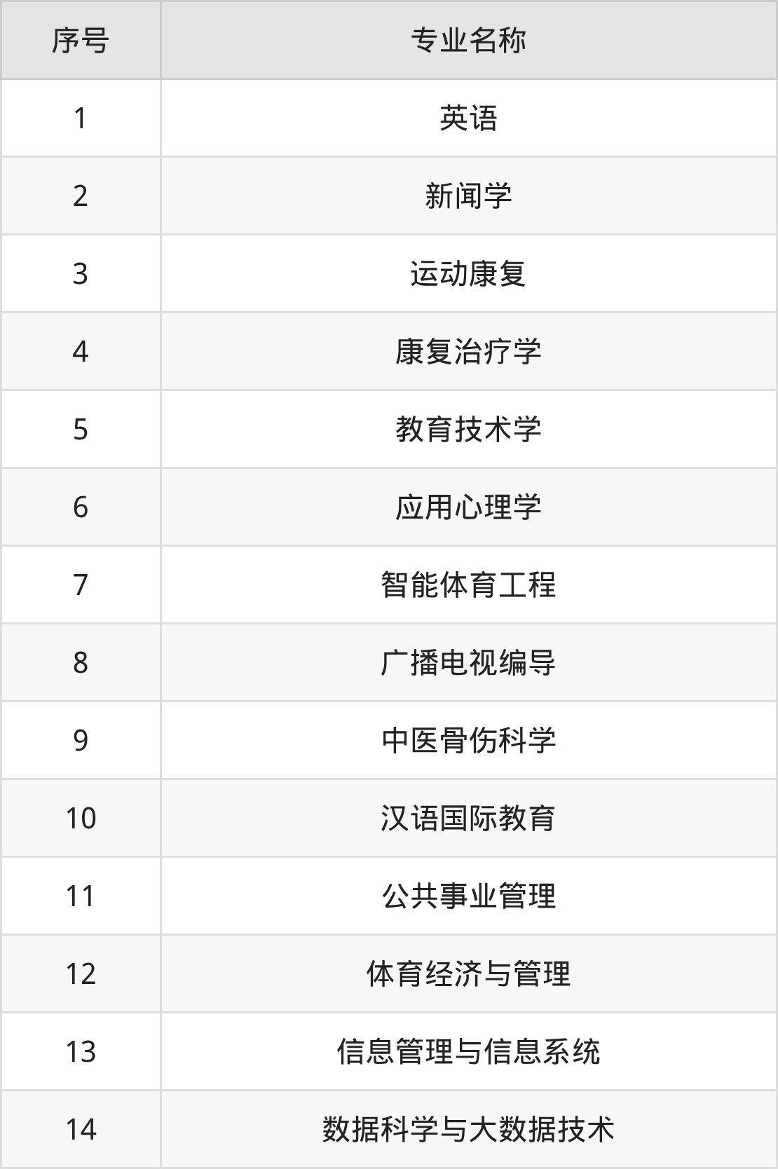 目前,武汉体育学院公布了2025年本科招生专业,共14个。