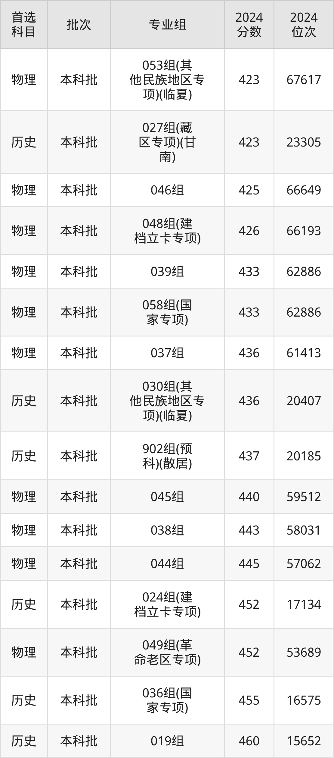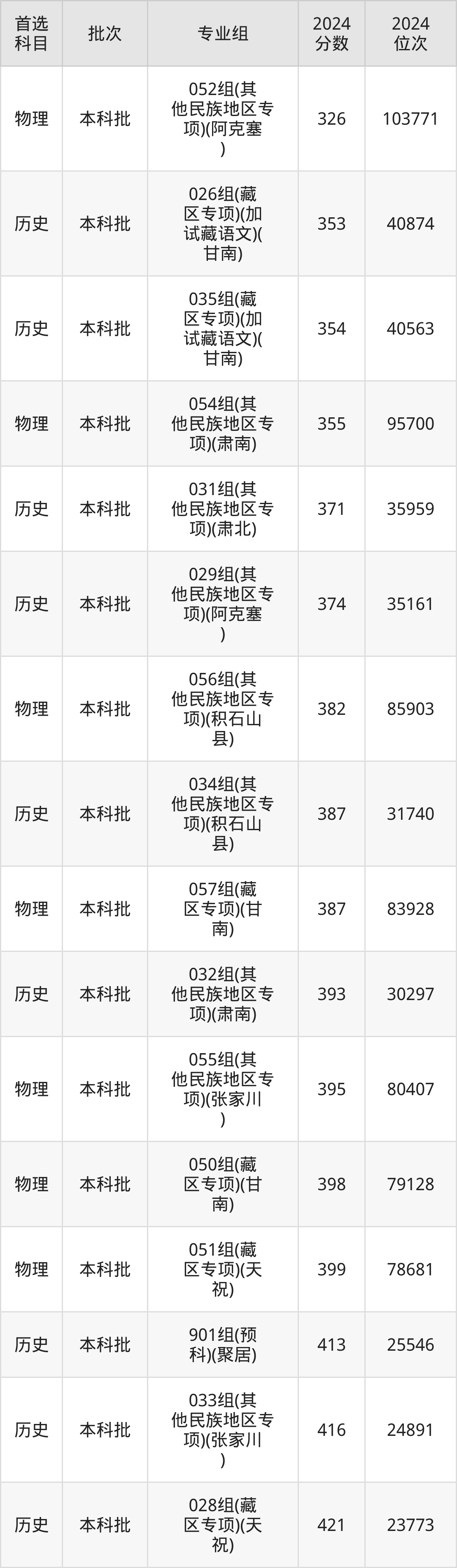 从2024年河西学院在甘肃省内的录取分数线来看,本科批录取分数线都在320分以上,录取分数线最高的是022组,2024年最低分为519分;录取分数线最低的是052组(其他民族地区专项)(阿克塞),2024年最低分为326分。