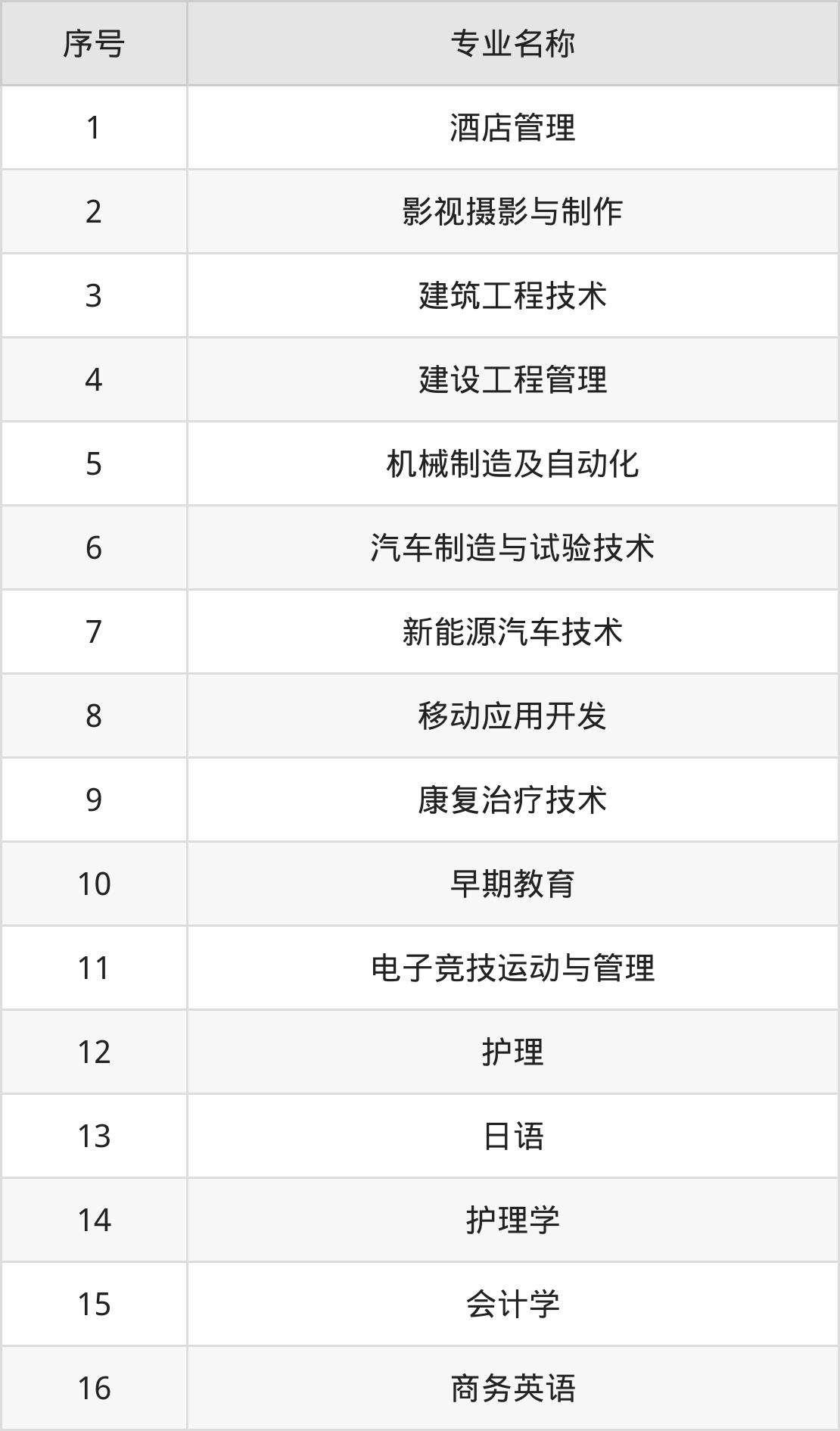 历史类(文科)本科招生专业:日语、护理学、会计学、商务英语、工程造价、财务管理、物流管理、国际商务、市场营销、学前教育等。