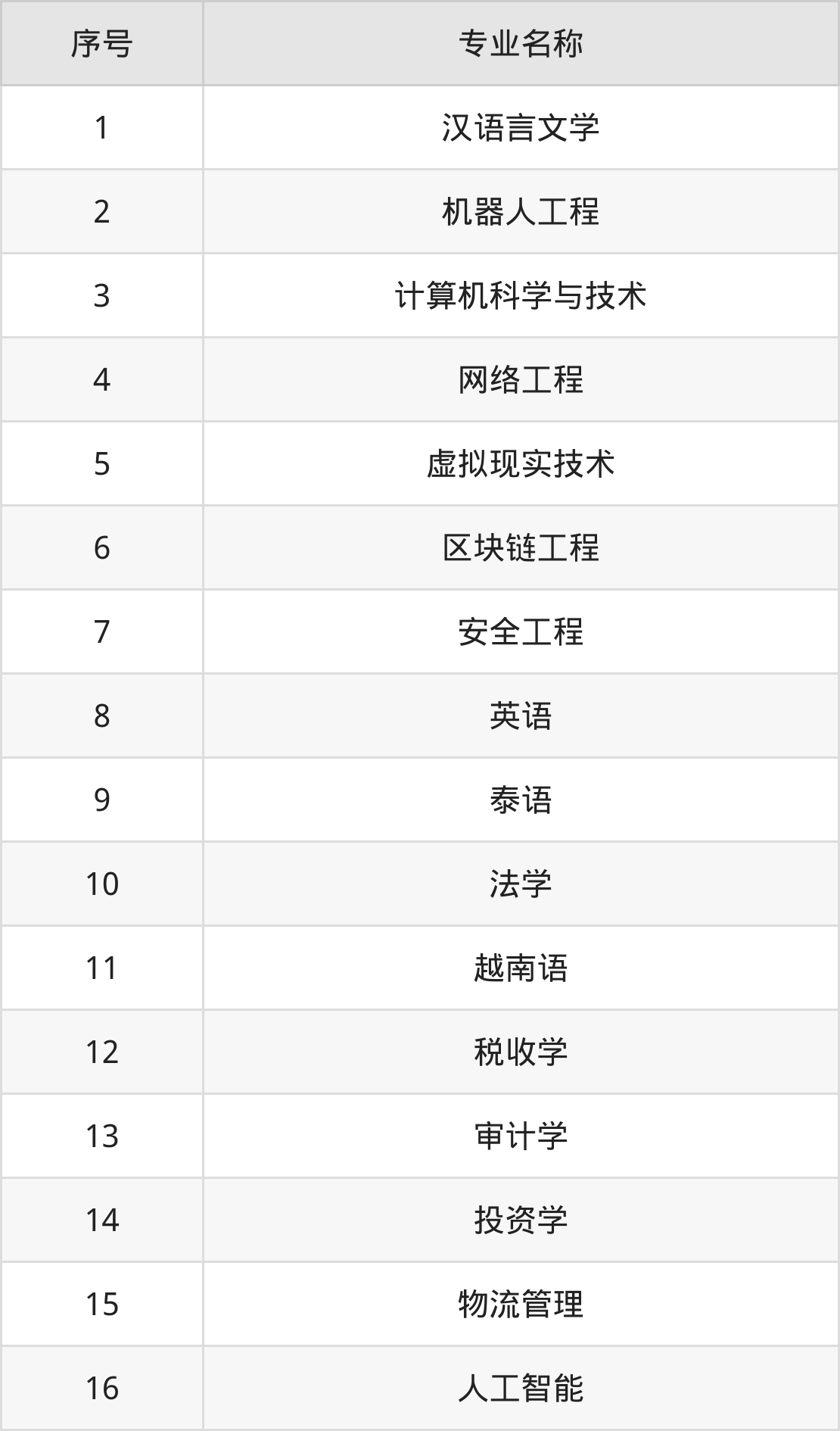 历史类(文科)本科招生专业:汉语言文学、英语、泰语、法学、投资学、税收学、审计学、越南语、物流管理、旅游管理等。