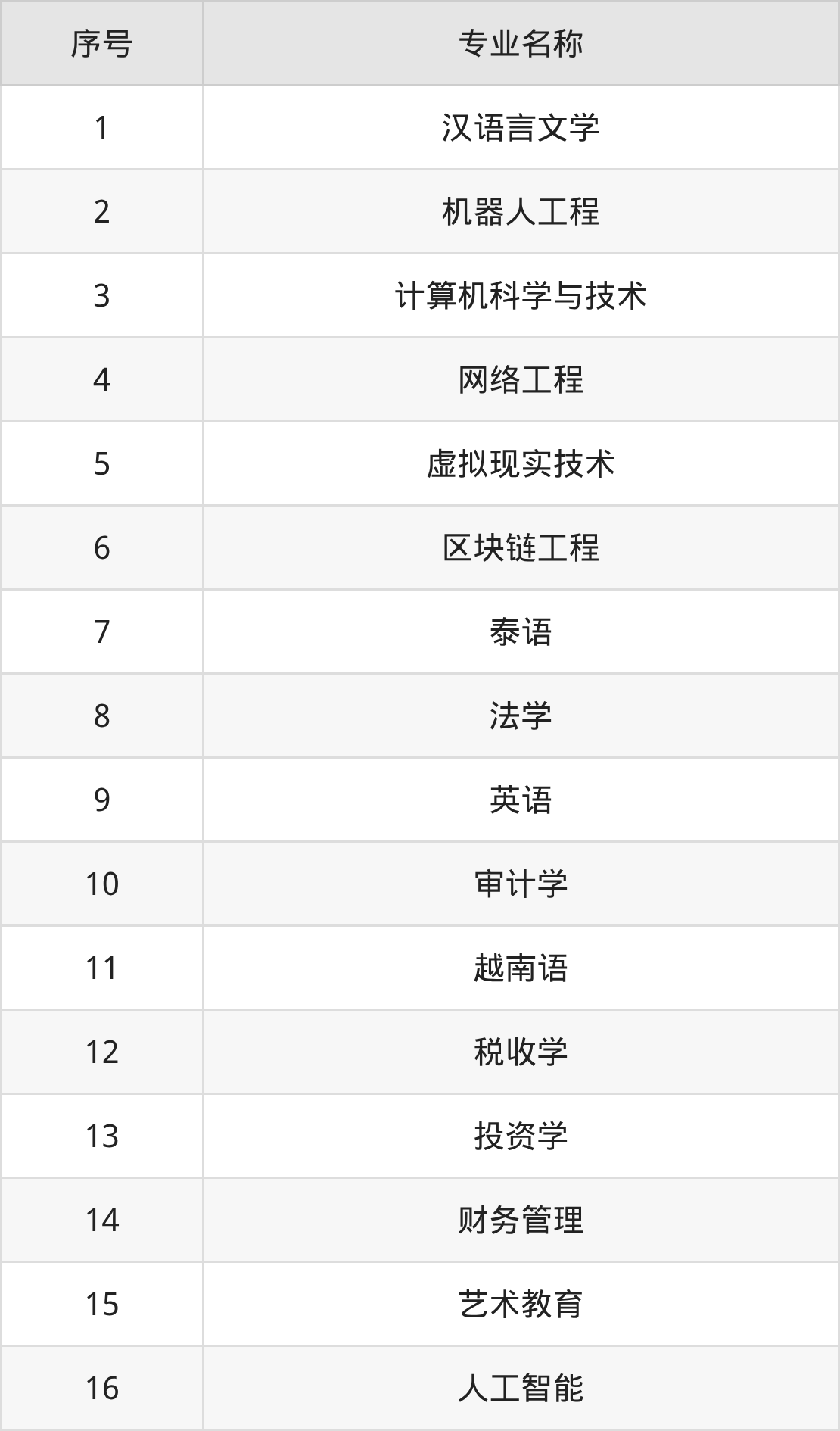 历史类(文科)本科招生专业:汉语言文学、法学、英语、泰语、越南语、审计学、投资学、税收学、财务管理、旅游管理等。