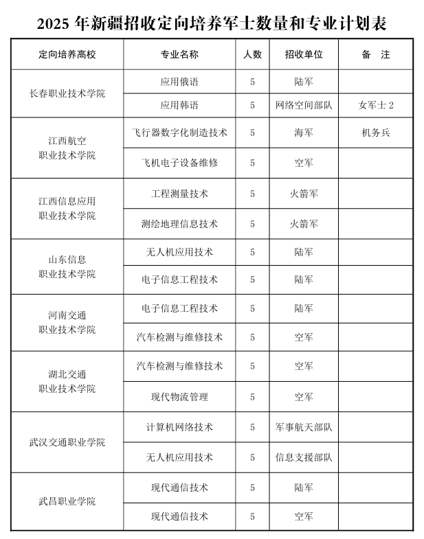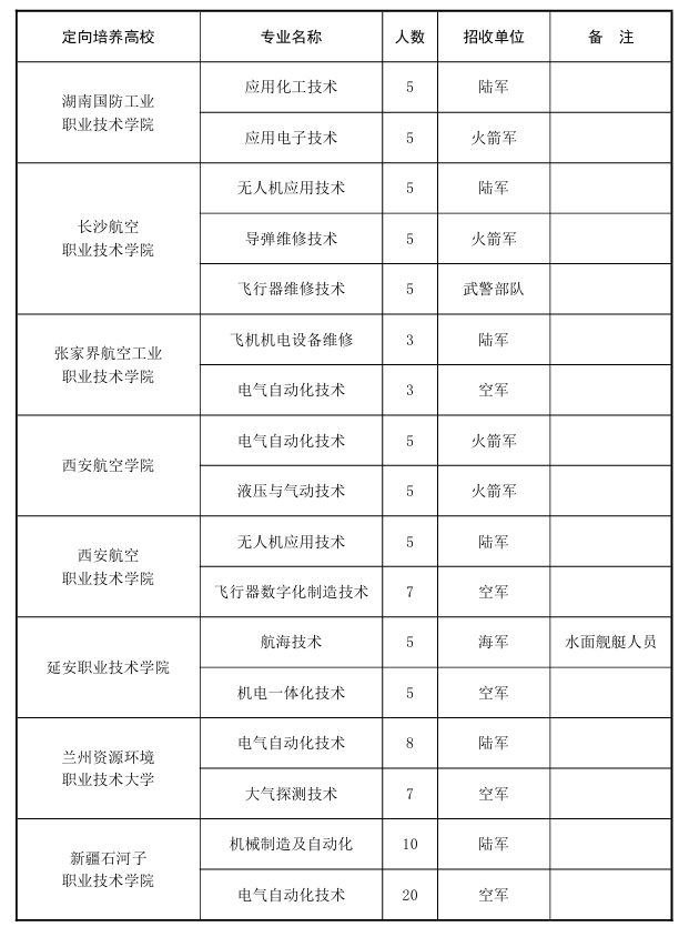 江西信息应用职业技术学院:工程测量技术(火箭军)5人、测绘地理信息技术(火箭军)5人。