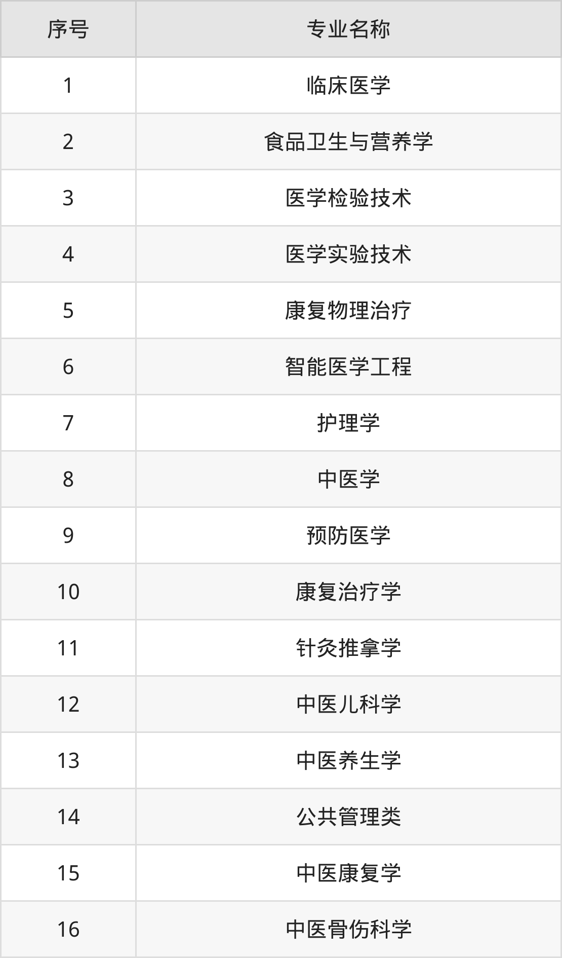 物理类(理科)本科招生专业:临床医学、食品卫生与营养学、医学检验技术、医学实验技术、康复物理治疗、智能医学工程、中医学、护理学、预防医学、中医康复学等。