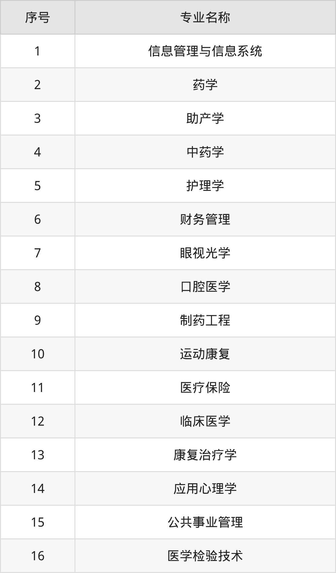 物理类(理科)本科招生专业:信息管理与信息系统、药学、护理学、助产学、中药学、运动康复、口腔医学、制药工程、临床医学、医疗保险等。