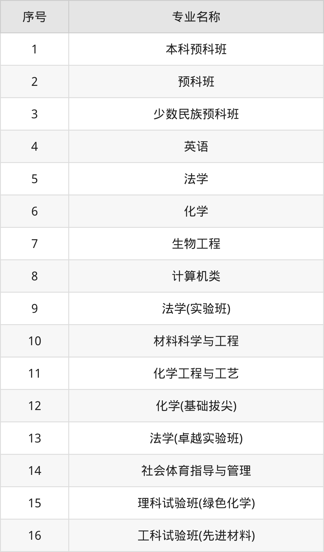 物理类(理科)本科招生专业:本科预科班、预科班、少数民族预科班、化学、计算机类、生物工程、化学工程与工艺、材料科学与工程、化学(基础拔尖)、社会体育指导与管理等。
