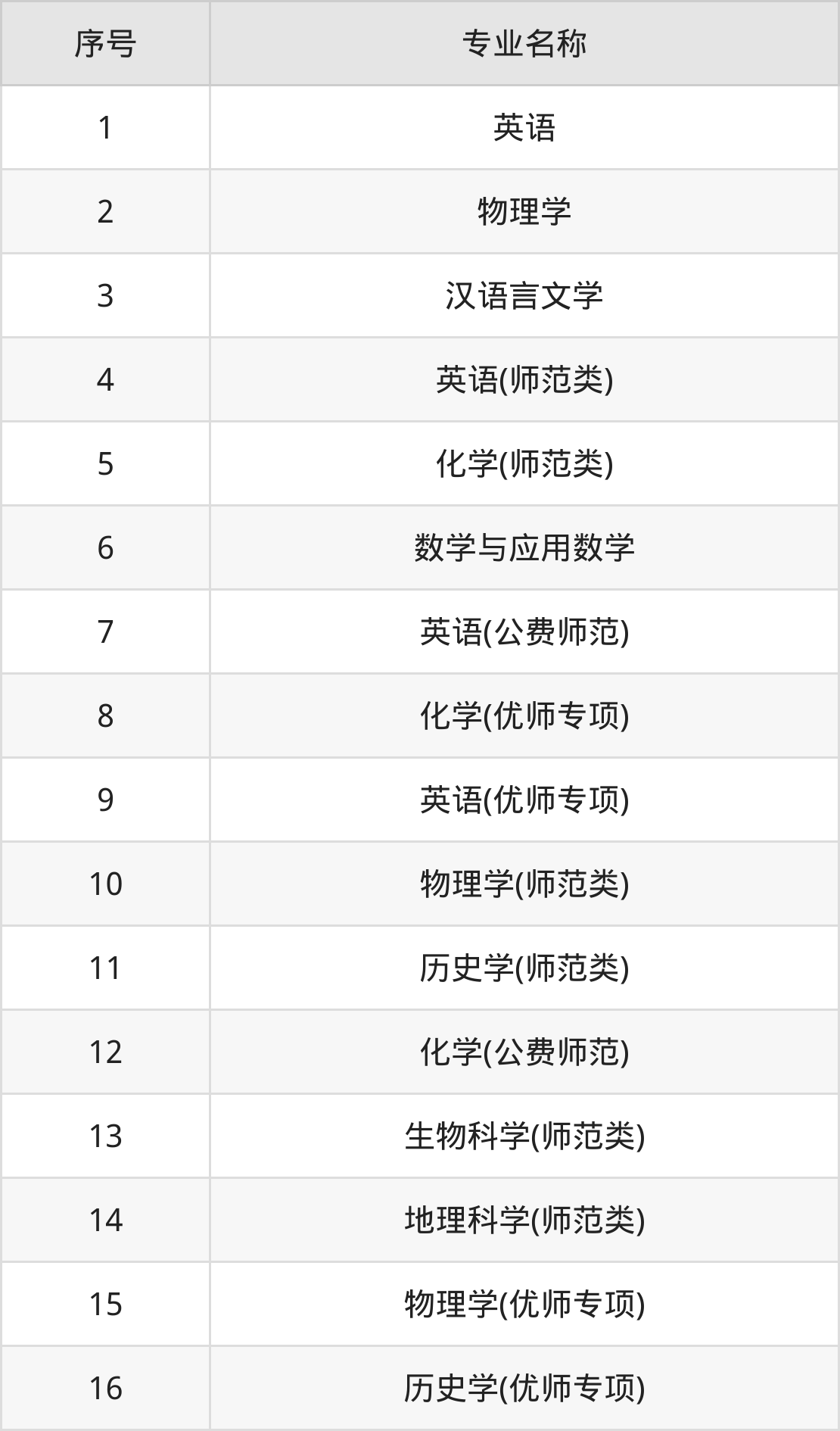物理类(理科)本科招生专业:物理学、数学与应用数学、化学(师范类)、英语(师范类)、化学(公费师范)、化学(优师专项)、英语(优师专项)、英语(公费师范)、物理学(师范类)、物理学(优师专项)等。