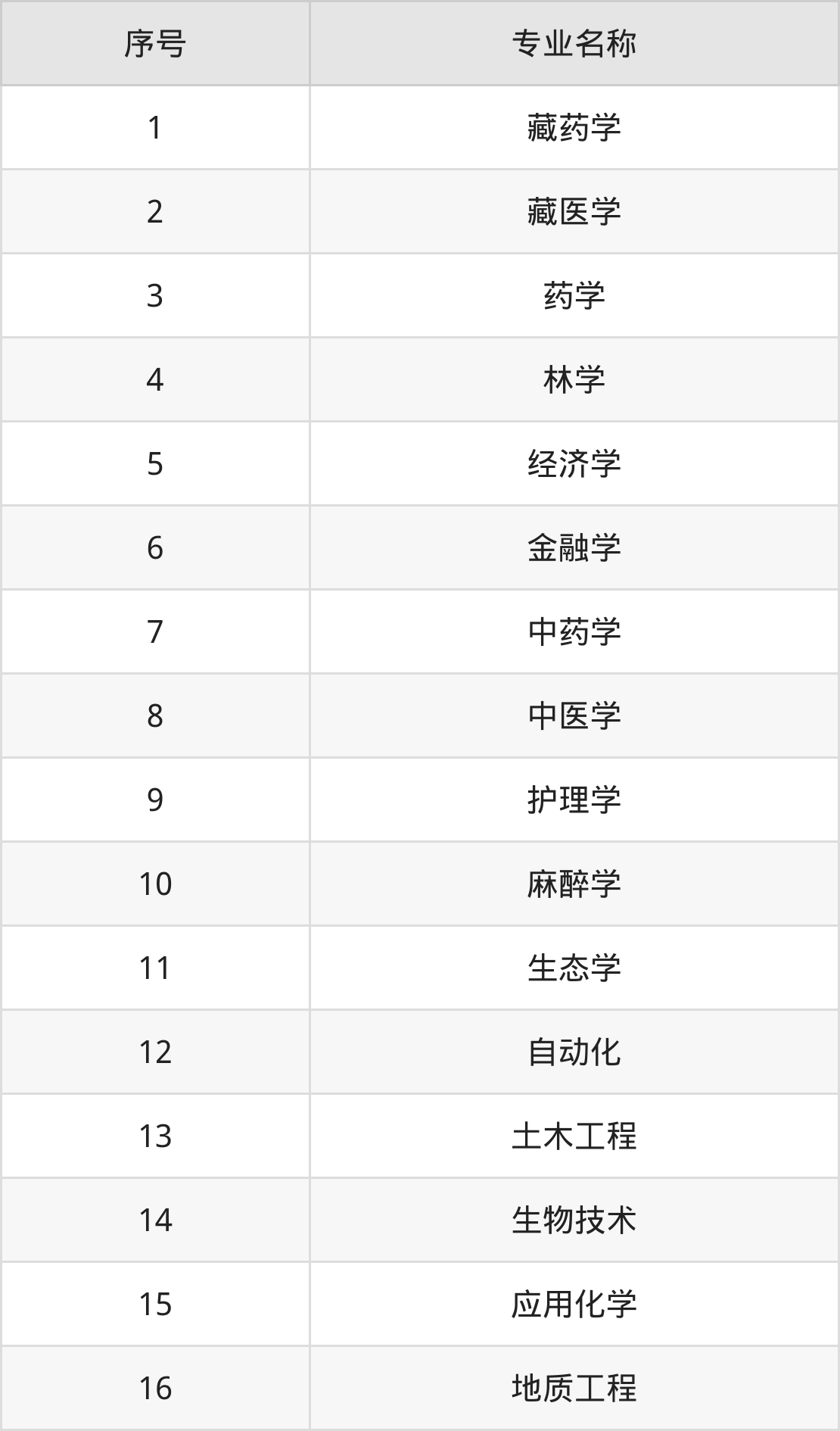 物理类(理科)本科招生专业:藏药学、藏医学、林学、药学、经济学、金融学、自动化、生态学、中药学、中医学等。