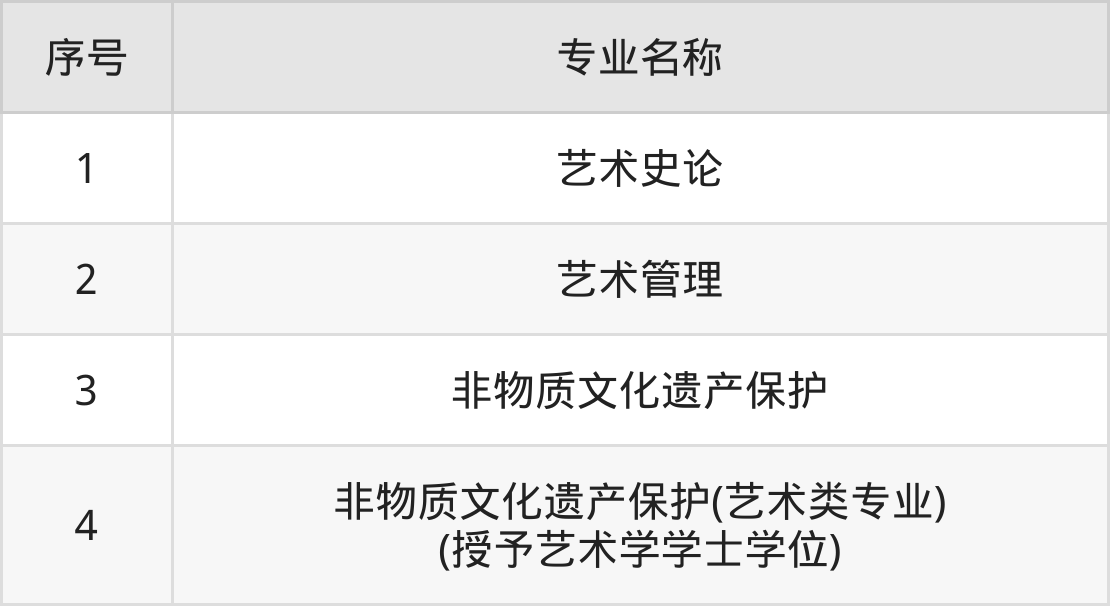 历史类(文科)本科招生专业:艺术史论、艺术管理、非物质文化遗产保护、非物质文化遗产保护(艺术类专业)(授予艺术学学士学位)。