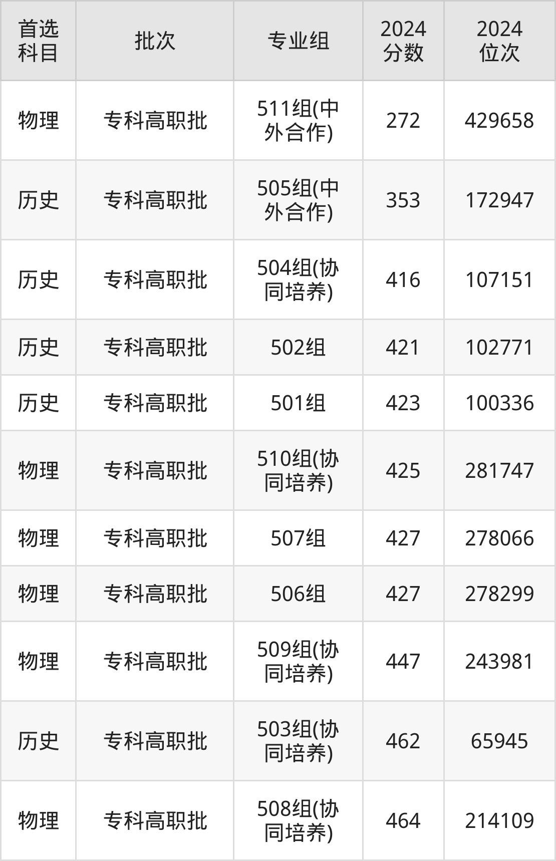 2024年广州城市职业学院在广东省内专科批的录取分数线都在270分以上,在历史类的录取分数线在353分-462分之间;物理类的录取分数线在272分-464分之间。