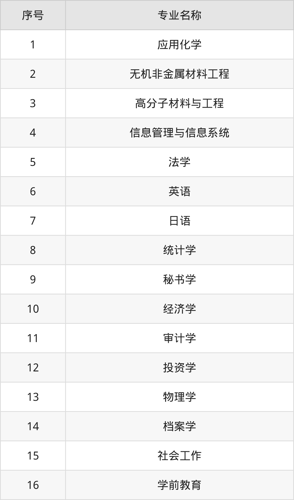 物理类(理科)本科招生专业:应用化学、无机非金属材料工程、高分子材料与工程、信息管理与信息系统、日语、法学、物理学、投资学、审计学、经济学等。