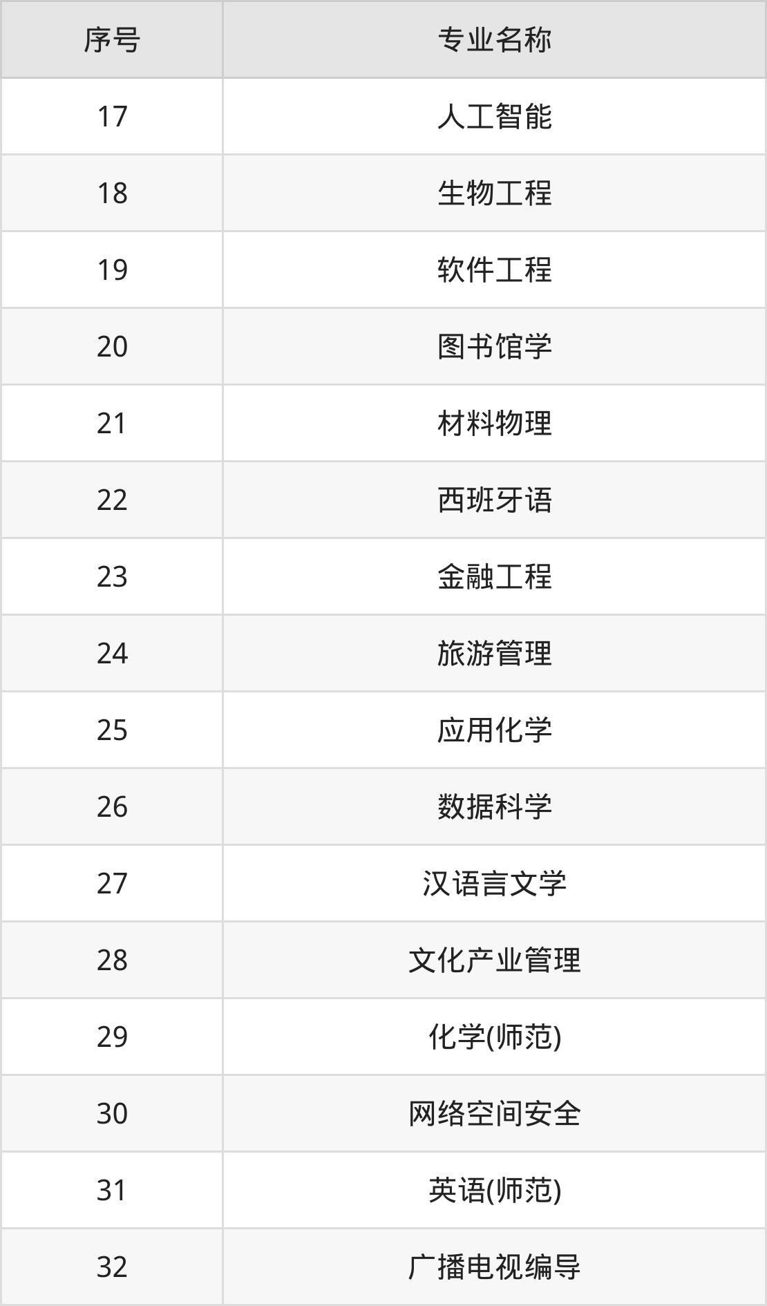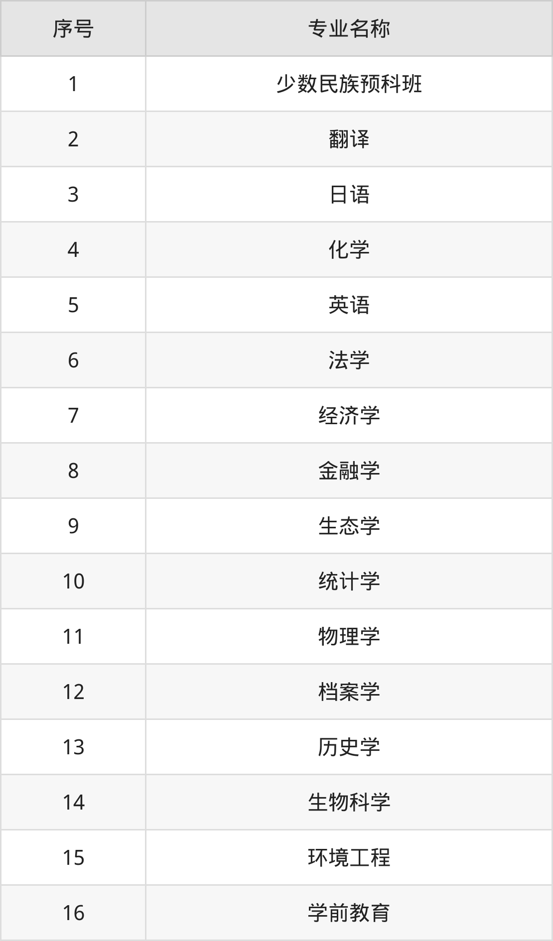 历史类(文科)本科招生专业:少数民族预科班、翻译、日语、英语、法学、档案学、金融学、历史学、学前教育、图书馆学等。