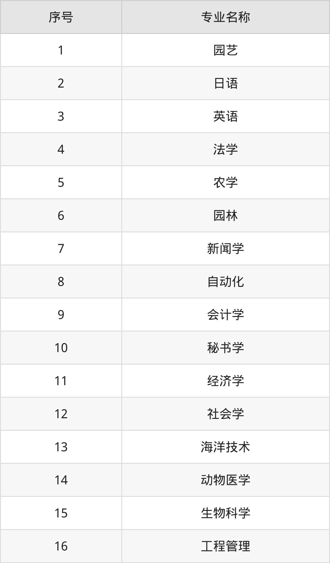 物理类(理科)本科招生专业:园艺、园林、农学、日语、英语、法学、会计学、社会学、自动化、经济学等。