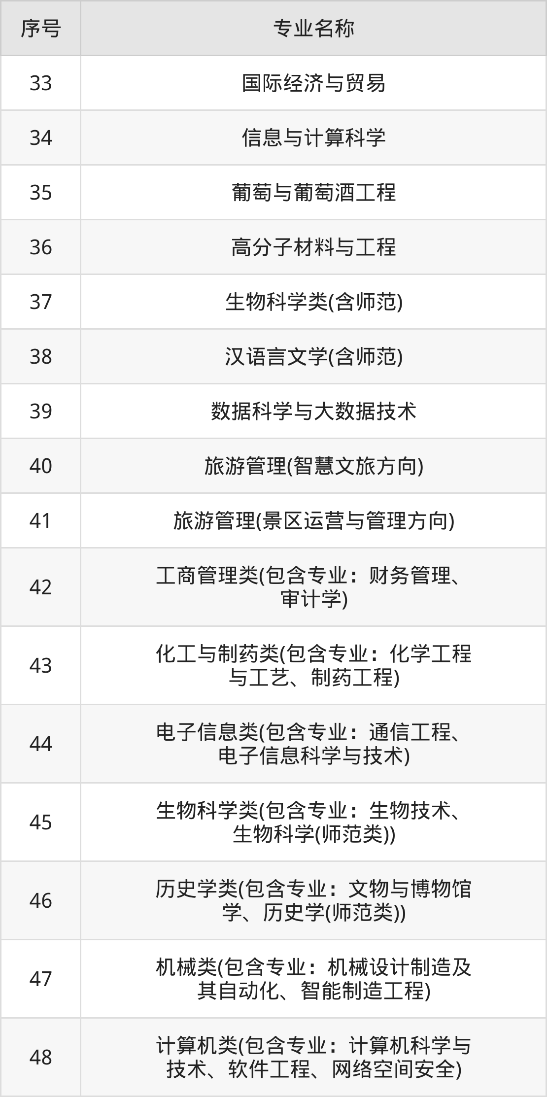 物理类(理科)本科招生专业:智能建造、计算机类、人工智能、土木工程、电子信息类、化工与制药类、信息与计算科学、高分子材料与工程、葡萄与葡萄酒工程、生物科学类(含师范)等。