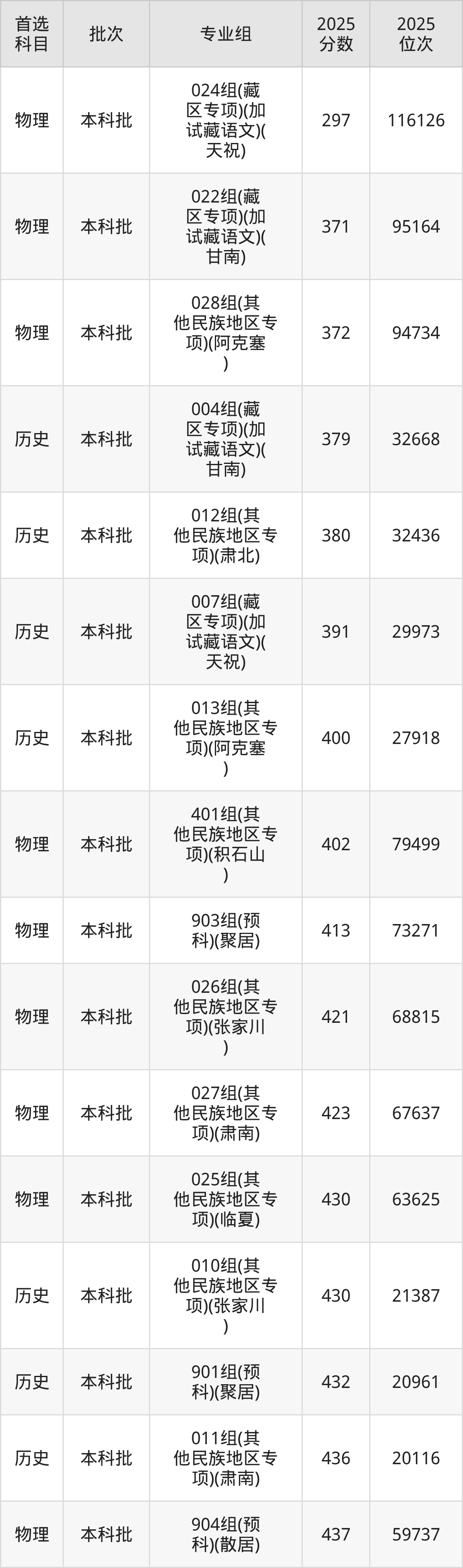 从2025年兰州财经大学在甘肃省内的录取分数线来看,本科批录取分数线都在290分以上,录取分数线最高的是016组(地方专项),2025年最低分为485分;录取分数线最低的是024组(藏区专项)(加试藏语文)(天祝),2025年最低分为297分。