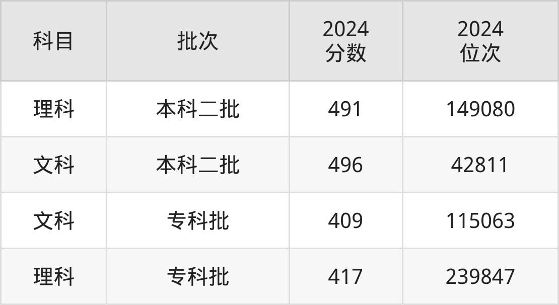 从2024年成都文理学院在四川省内的录取分数线来看,本科批录取分数线都在490分以上,录取分数线最高的是文科,2024年最低分为496分;录取分数线最低的是理科,2024年最低分为491分。