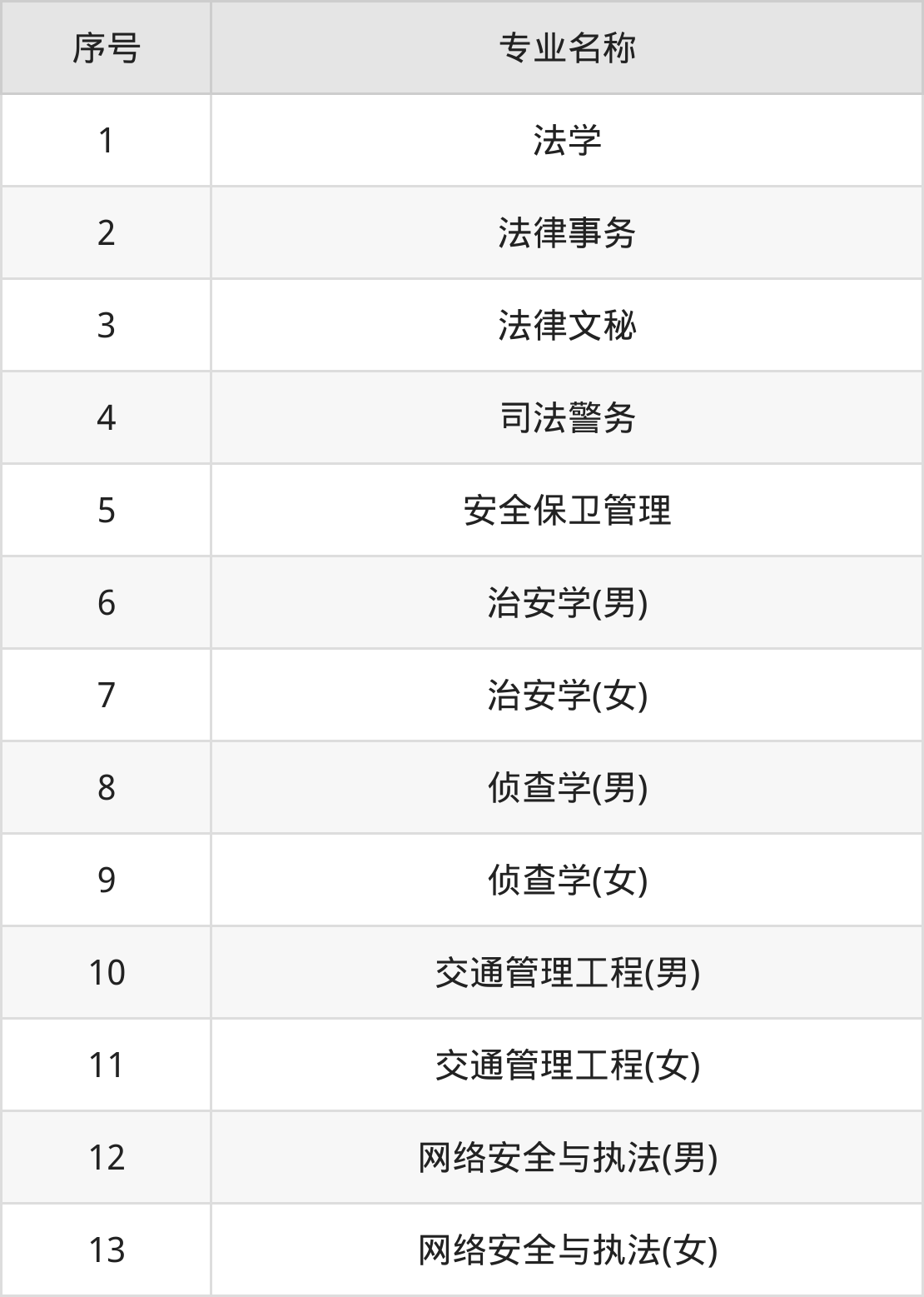 物理类(理科)本科招生专业:治安学(男)、治安学(女)、侦查学(男)、侦查学(女)、交通管理工程(男)、交通管理工程(女)、网络安全与执法(男)、网络安全与执法(女)。