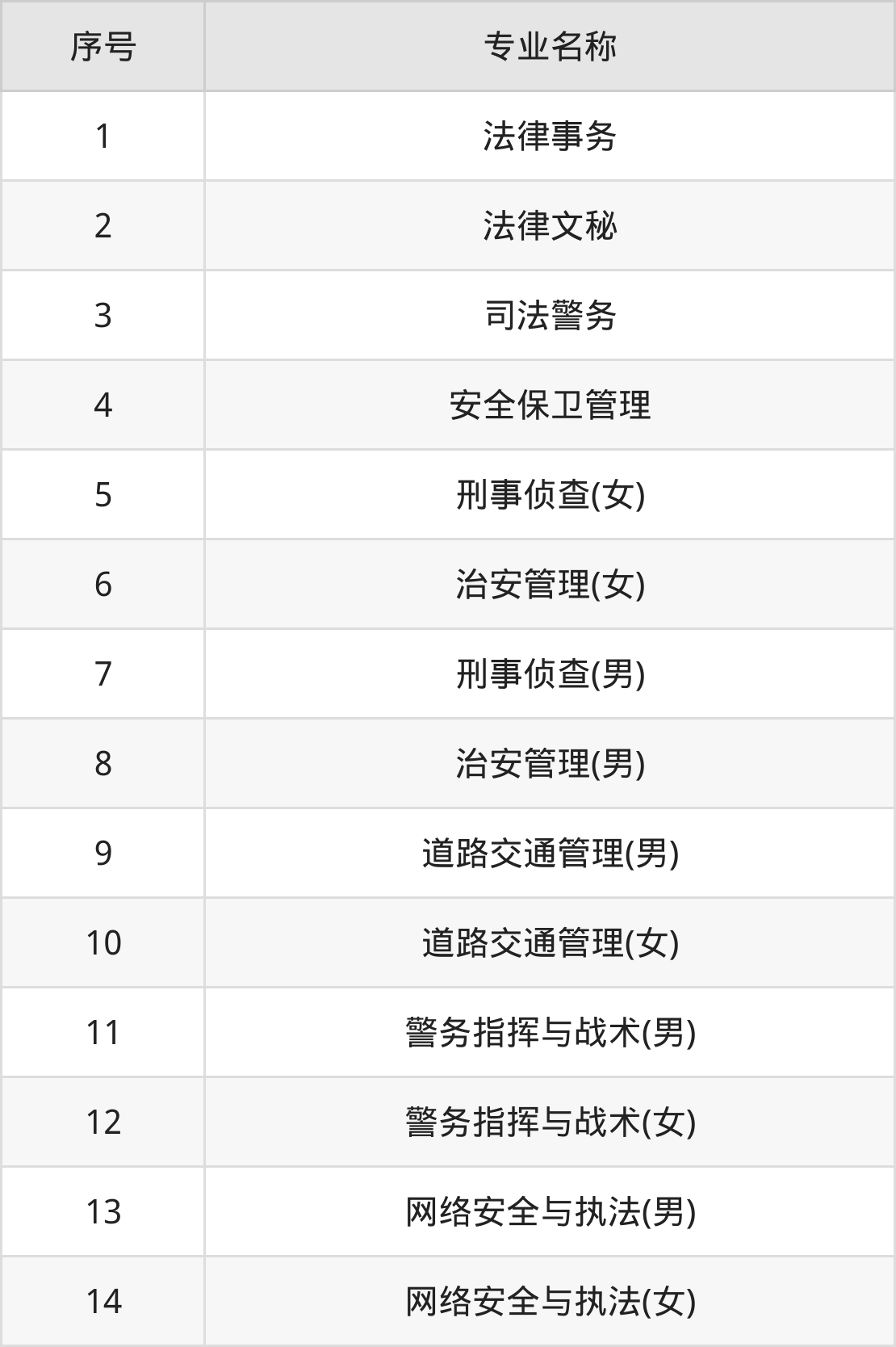 历史类(文科)本科招生专业:法学、治安学(男)、治安学(女)、侦查学(男)、侦查学(女)。