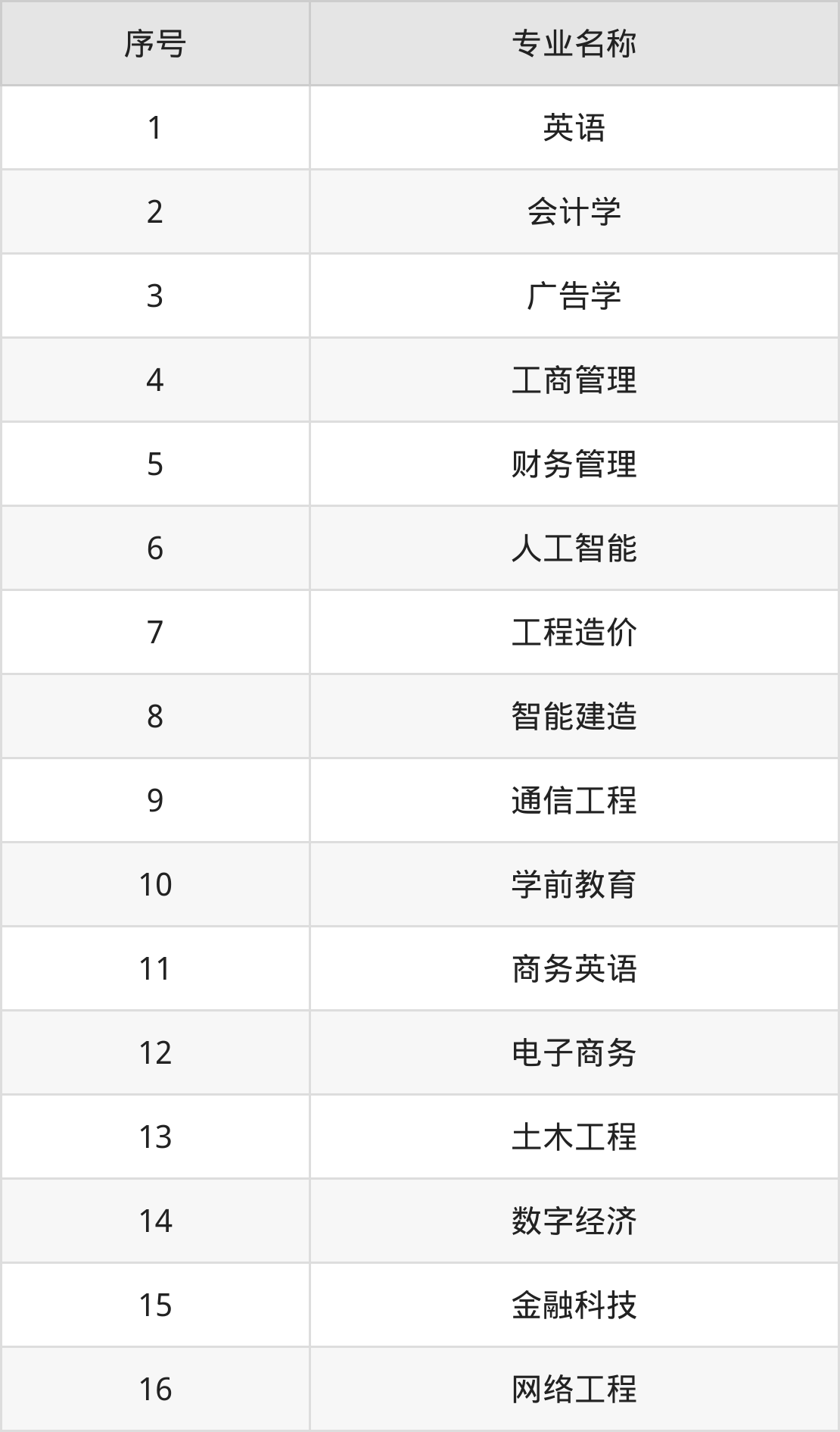 历史类(文科)本科招生专业:英语、会计学、广告学、工商管理、商务英语、学前教育、财务管理、电子商务、金融科技、汉语言文学等。