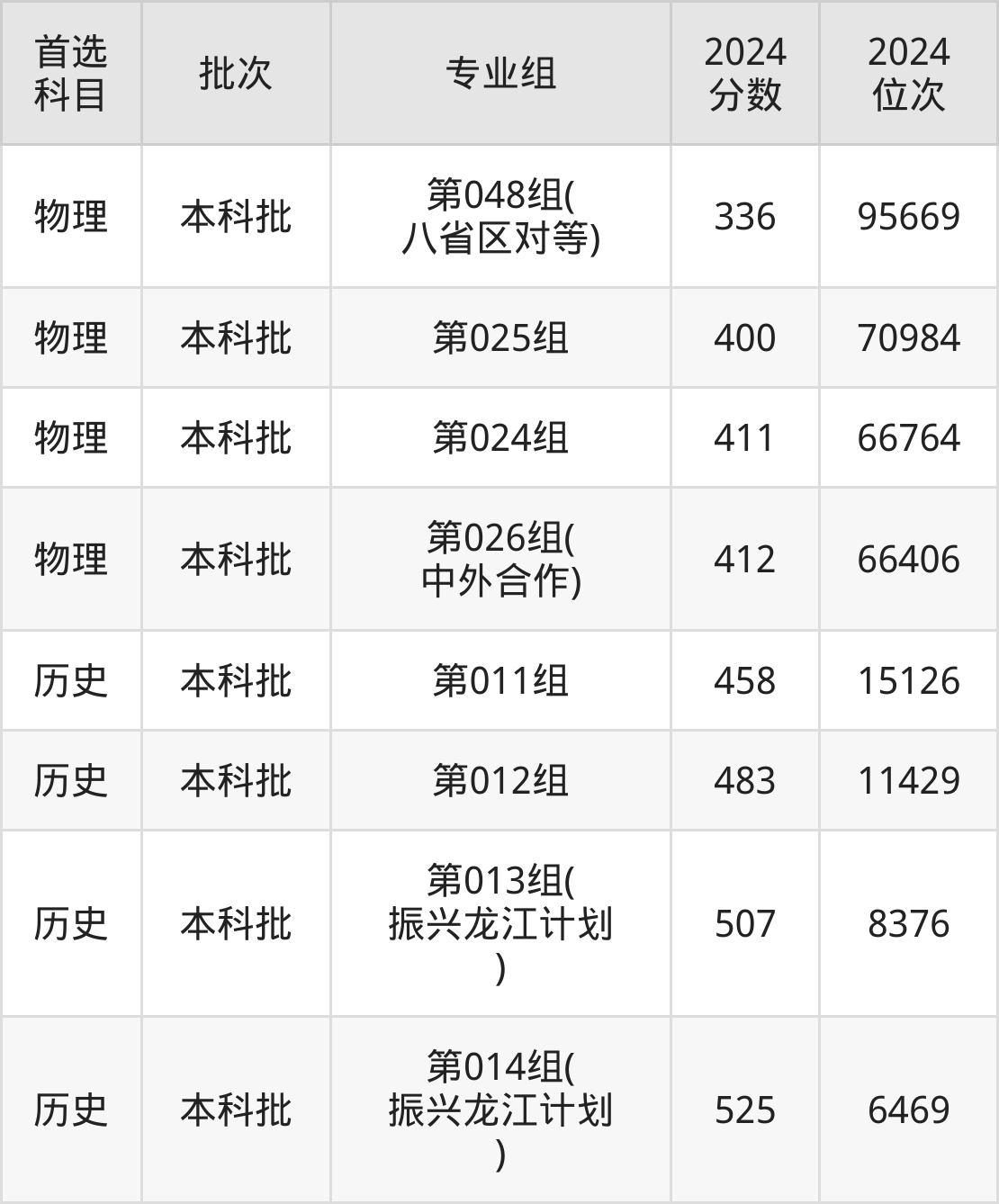 从2024年大庆师范学院在黑龙江省内的录取分数线来看,本科批录取分数线都在330分以上,录取分数线最高的是第014组(振兴龙江计划),2024年最低分为525分;录取分数线最低的是第048组(八省区对等),2024年最低分为336分。