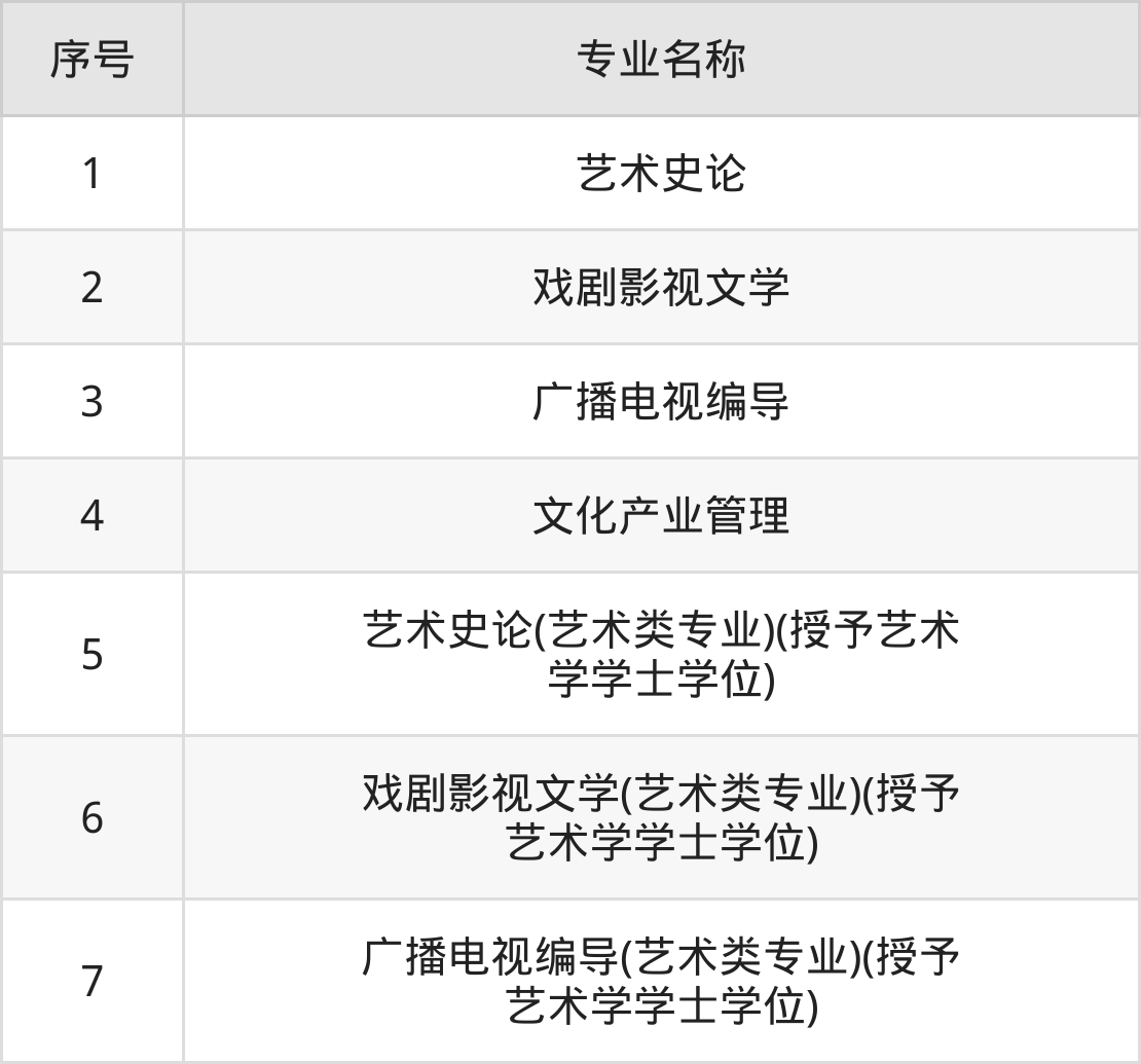 历史类(文科)本科招生专业:艺术史论、戏剧影视文学、广播电视编导、文化产业管理、艺术史论(艺术类专业)(授予艺术学学士学位)、戏剧影视文学(艺术类专业)(授予艺术学学士学位)、广播电视编导(艺术类专业)(授予艺术学学士学位)。