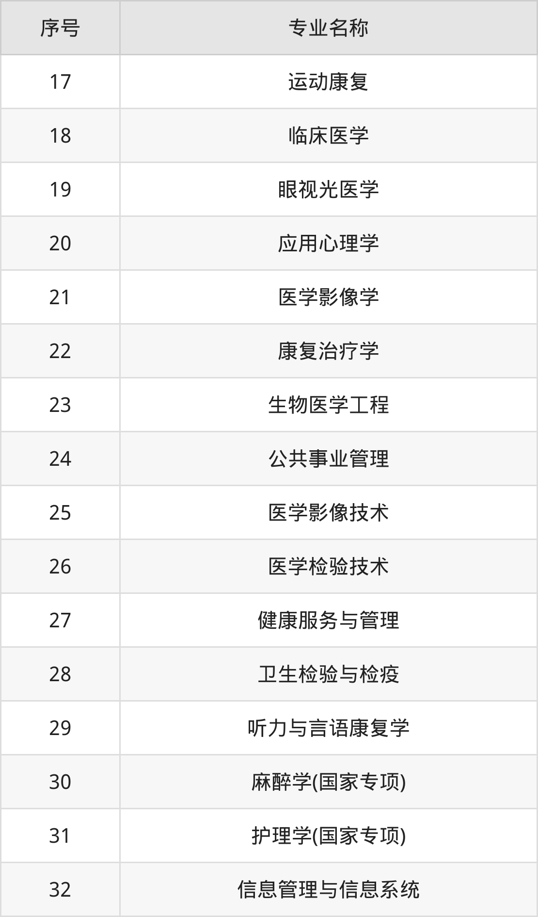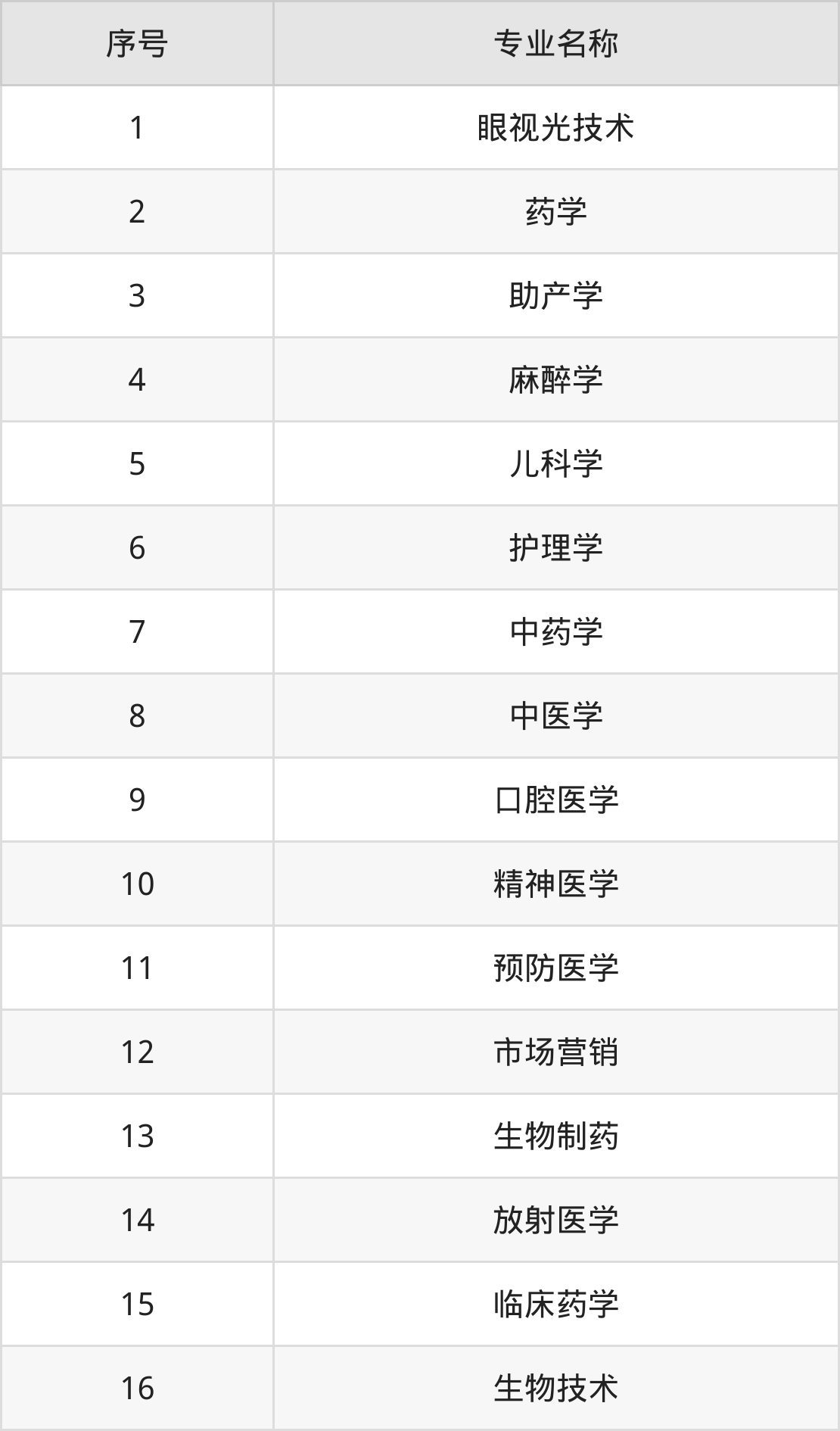 物理类(理科)本科招生专业:药学、中医学、麻醉学、儿科学、助产学、护理学、中药学、临床医学、生物制药、预防医学等。