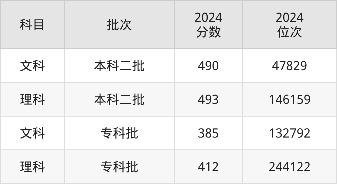 从2024年电子科技大学成都学院在四川省内的录取分数线来看,本科批录取分数线都在490分以上,录取分数线最高的是理科,2024年最低分为493分;录取分数线最低的是文科,2024年最低分为490分。