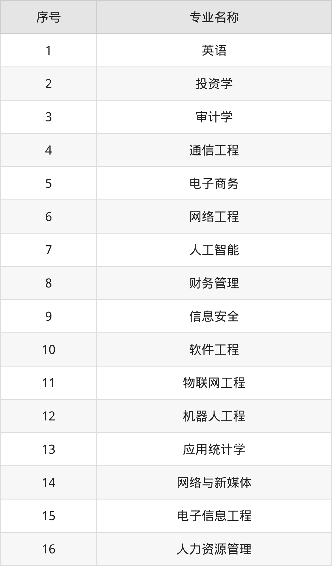 历史类(文科)本科招生专业:英语、审计学、投资学、财务管理、电子商务、人力资源管理、网络与新媒体、数字媒体技术、国际经济与贸易、信息管理与信息系统。