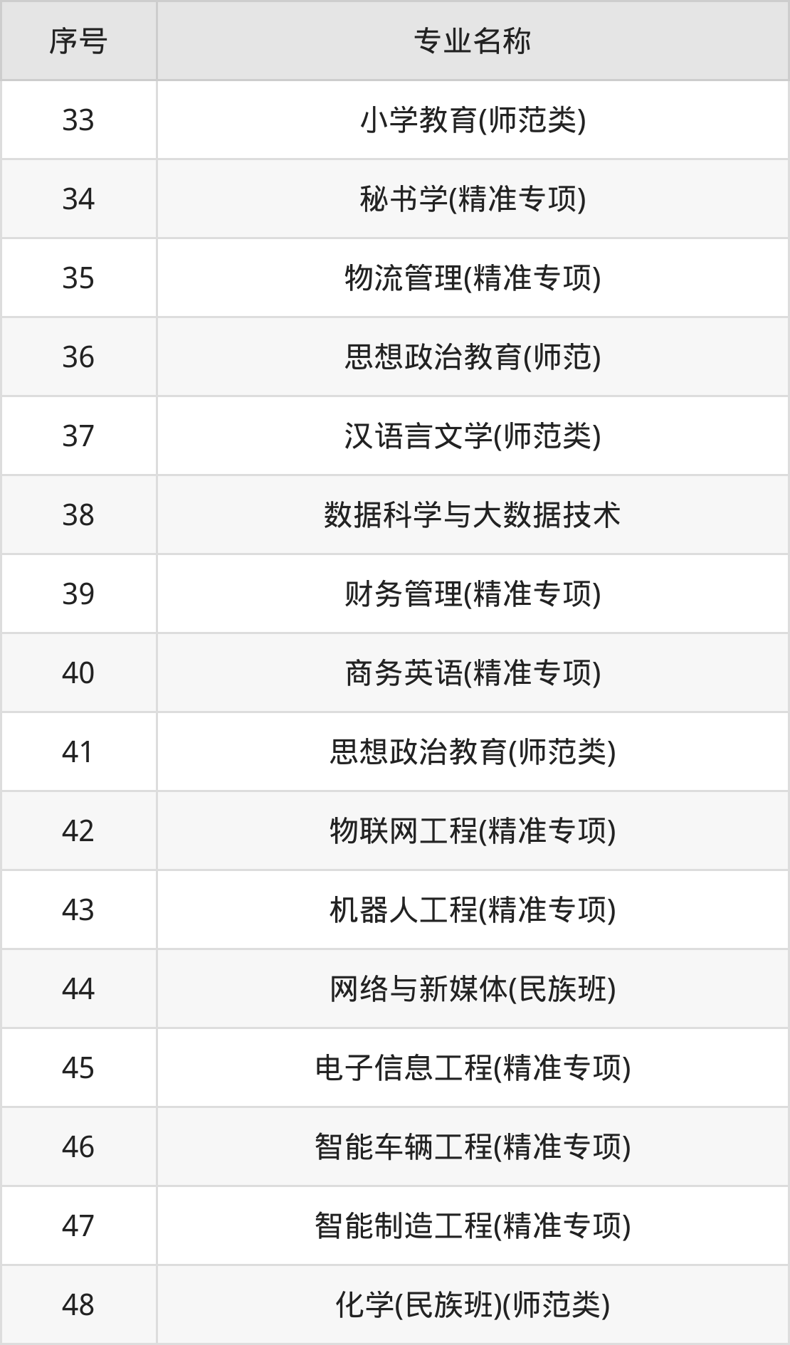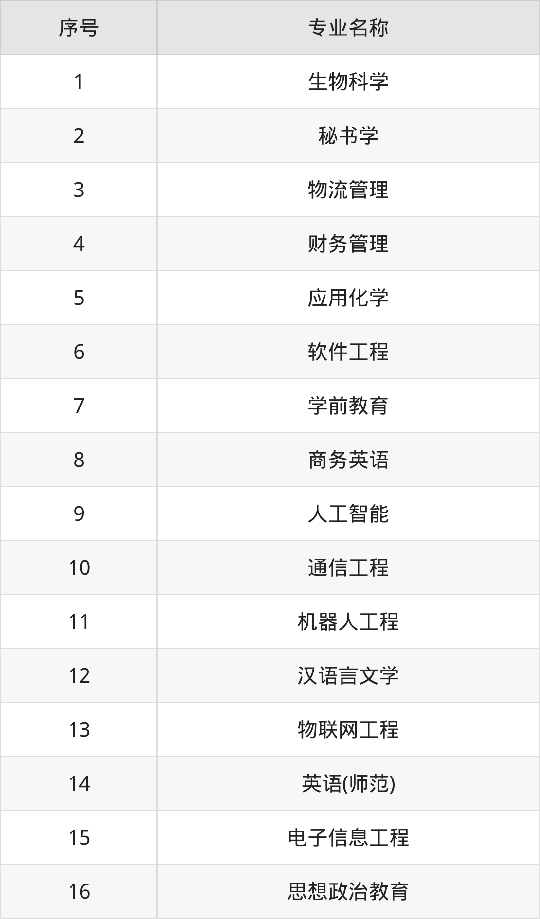 历史类(文科)本科招生专业:秘书学、物流管理、财务管理、商务英语、汉语言文学、英语(师范)、网络与新媒体、思想政治教育、英语(师范类)、学前教育(师范)等。