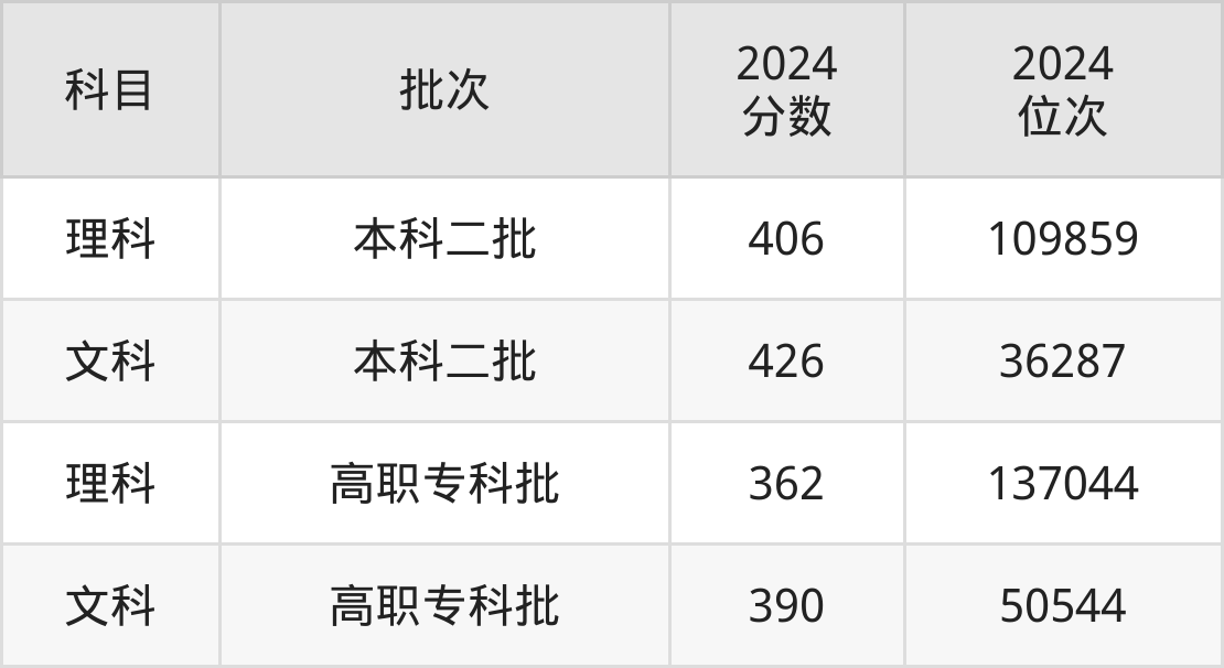 从2024年西安欧亚学院在陕西省内的录取分数线来看,本科批录取分数线都在400分以上,录取分数线最高的是文科,2024年最低分为426分;录取分数线最低的是理科,2024年最低分为406分。