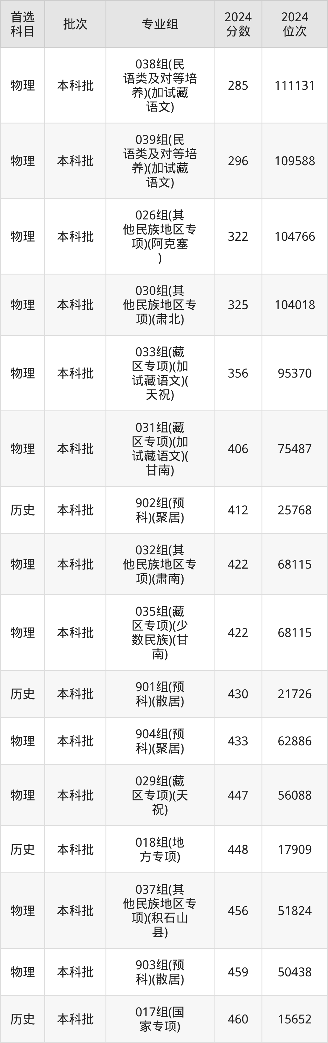 从2024年甘肃中医药大学在甘肃省内的录取分数线来看,本科批录取分数线都在280分以上,录取分数线最高的是020组,2024年最低分为569分;录取分数线最低的是038组(民语类及对等培养)(加试藏语文),2024年最低分为285分。